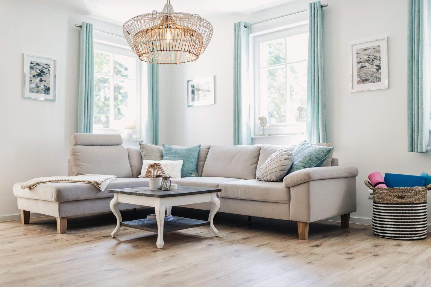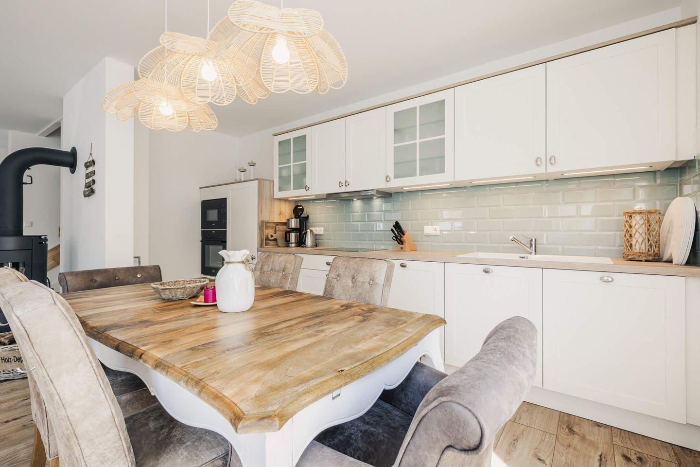 Gemütlich & modern: Wohnzimmer mit Kamin, voll ausgestattete Küche, drei Schlafzimmer u.a. mit bequemen Boxspringbetten, zwei Badezimmer, davon ein Bad mit Sauna, zwei Parkplätze