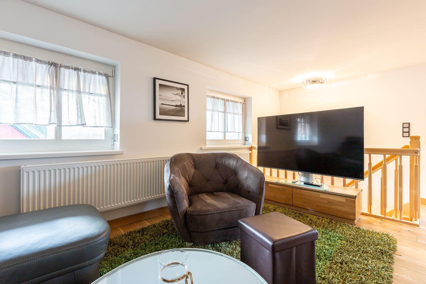 Noch eine Treppe höher erwartet dich ein Chillout-Bereich mit Sofa – der perfekte Ort, um die Ruhe zu genießen und den Ausblick auf die umliegende Natur schweifen zu lassen. Ein kleiner Balkon ergänzt das Angebot und schafft zusätzlichen Raum für entspannte Momente an der frischen Luft.