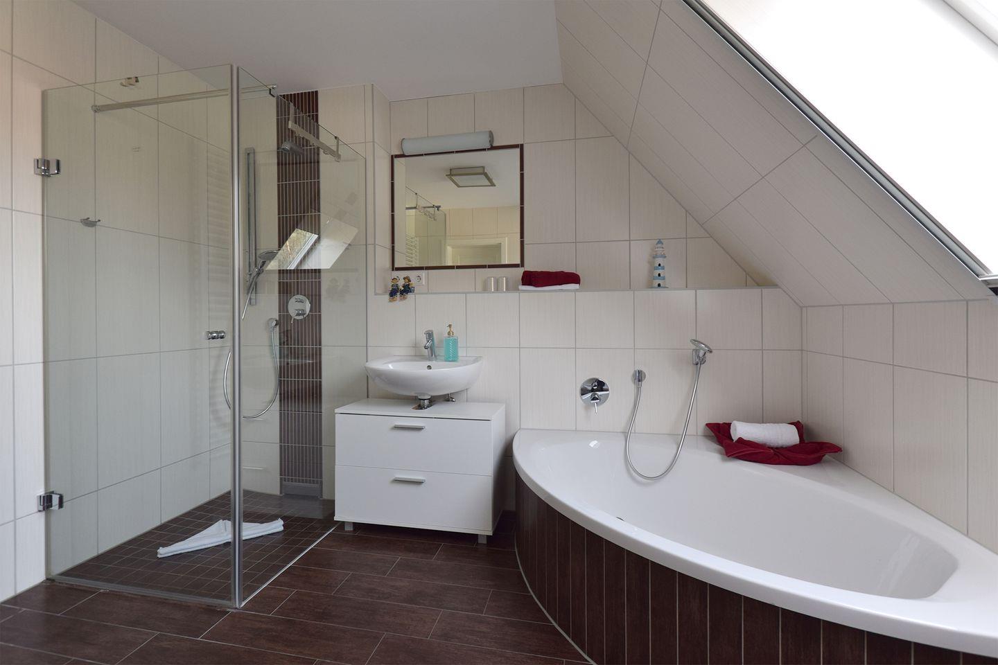 Das Badezimmer bietet neben einer bodengleichen Dusche auch eine Badewanne und ein Bidet, sodass Sie zwischen einem entspannenden Bad oder einer erfrischenden Dusche wählen können.