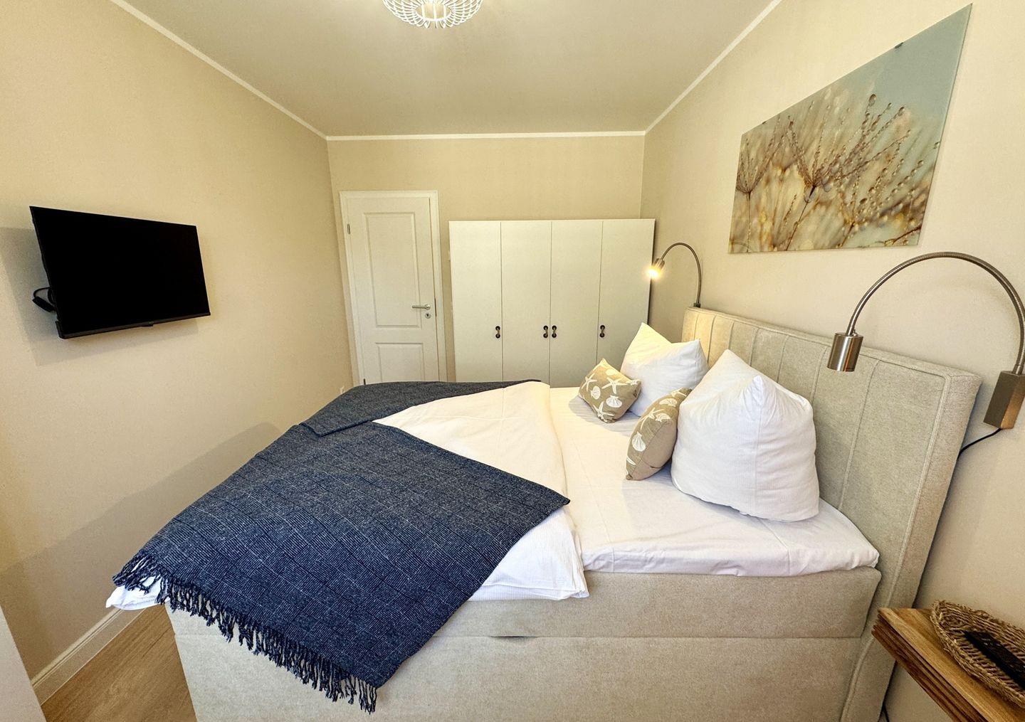 Das Schlafzimmer verspricht mit seinem modernen Boxspringbett erholsame Nächte und ruhige Morgen. Das moderne Badezimmer mit bodengleicher Dusche und Waschmaschine rundet den Komfort ab und macht auch längere Aufenthalte besonders angenehm.