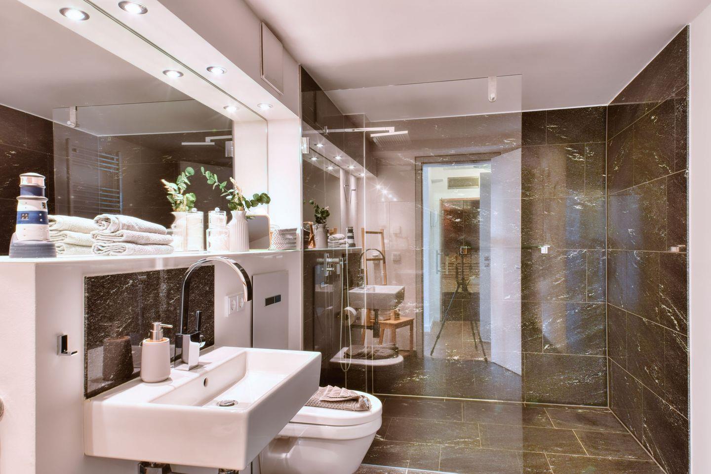 Beide Schlafzimmer versprechen erholsame und entspannende Nächte. In den großen Boxspringdoppelbetten der Marke Schramm wird das Schlafen zum Vergnügen. Die beiden Schlafzimmer haben einem Flachbild-TV. Im Masterbad wartet zudem eine kleine Wellness-Oase darauf, Ihnen noch mehr Entspannung zu verschaffen. Eine klassische Sauna von der Firma RUKU ist der ideale Ort, sich an ungemütlichen Tagen die Zeit zu verschönern – besonders nach einem stürmischen Strandspaziergang. Auch Ablagemöglichkeiten gibt es in den Zimmern reichlich.