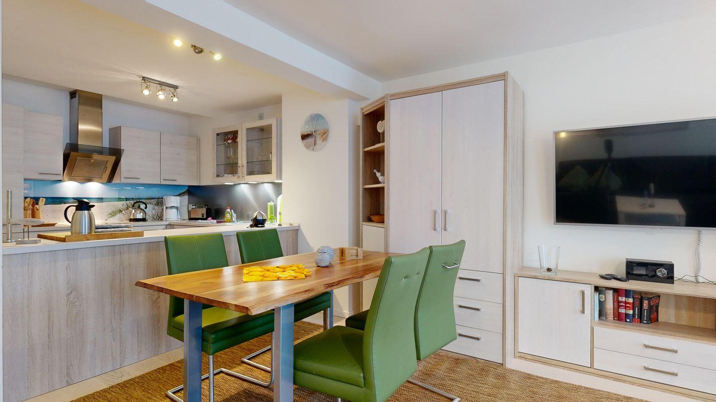 * Großer Wohnraum: Couchgarnitur (Schlafcouch für 1-2 Personen), großer Flachbildschirm, Internetzugang (WLAN inkl.), Esstisch für 4-6 Personen, Schrank für Stauraum