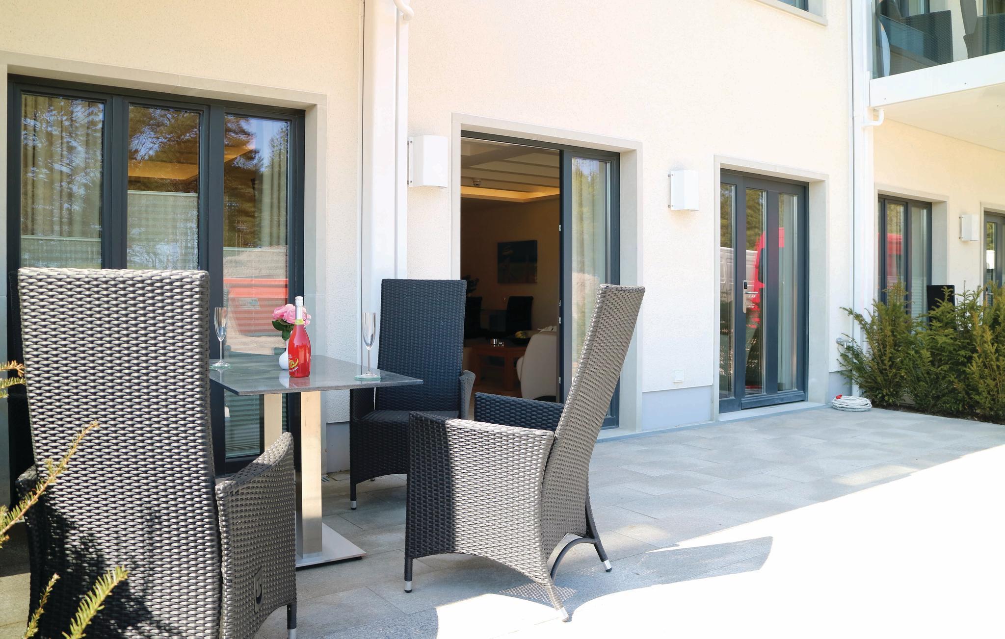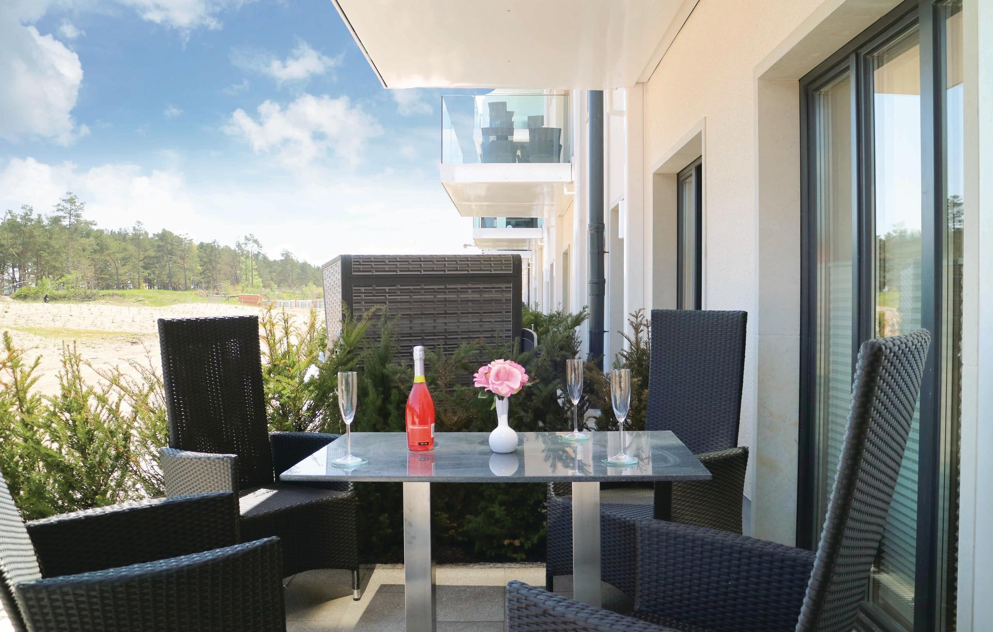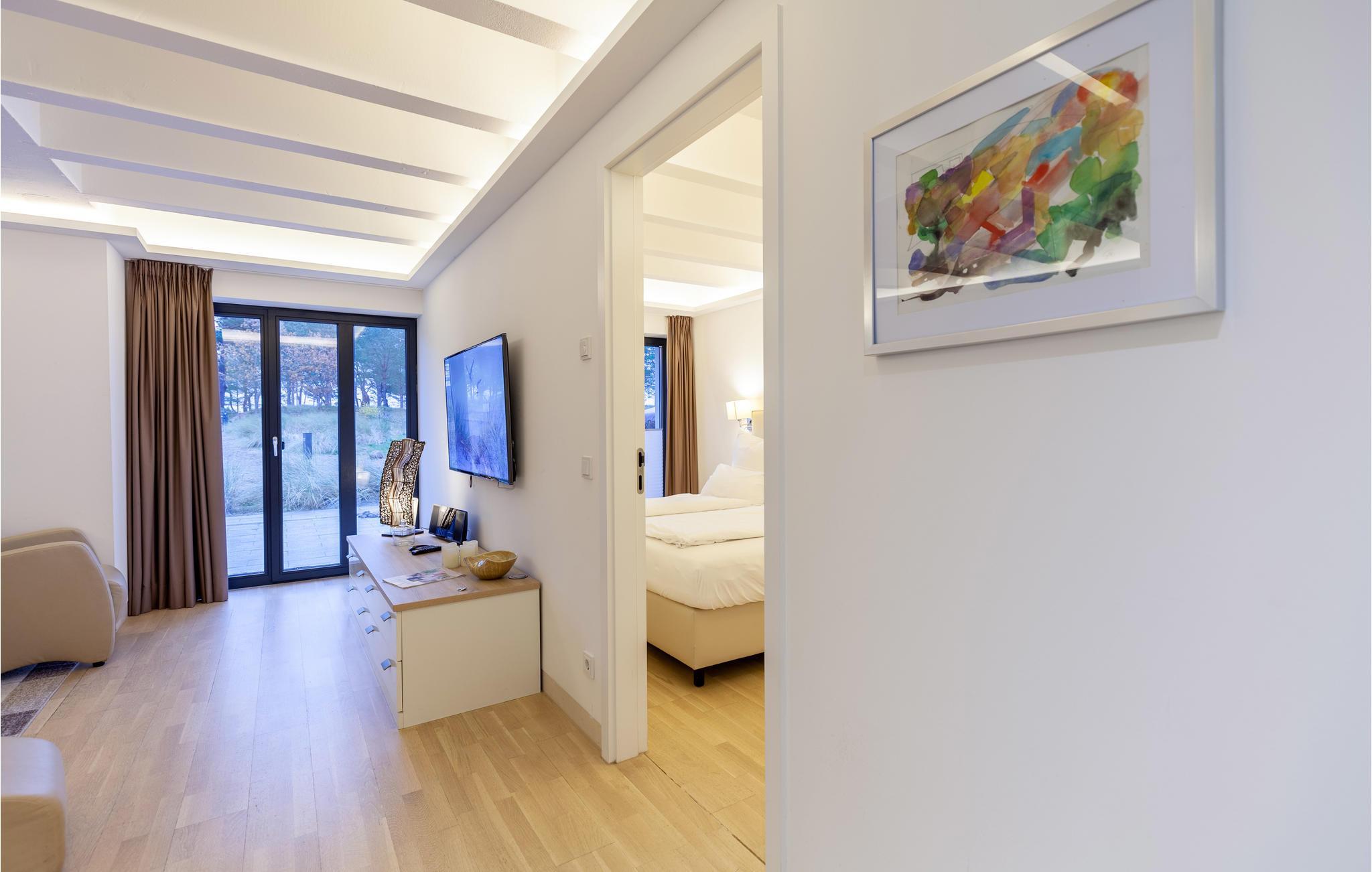Soverommet er utstyrt med en høykvalitets og særdeles romslig dobbeltseng (2x2 m) og egen TV. Leiligheten har også plass til ytterligere to gjester på en komfortabel sovesofa (1,60 x 2,00 m) i det store oppholdsrommet. Moderne utemøbler er tilgjengelig på leilighetens store, private terrasse. Solsengene innbyr til avslappende timer i den friske Østersjøluften.