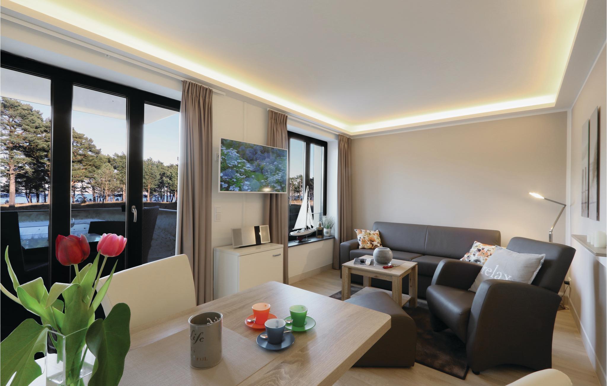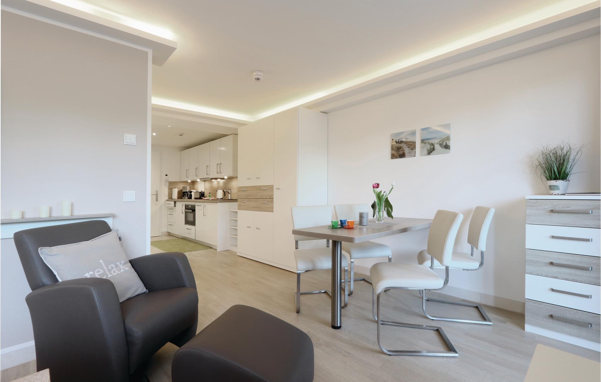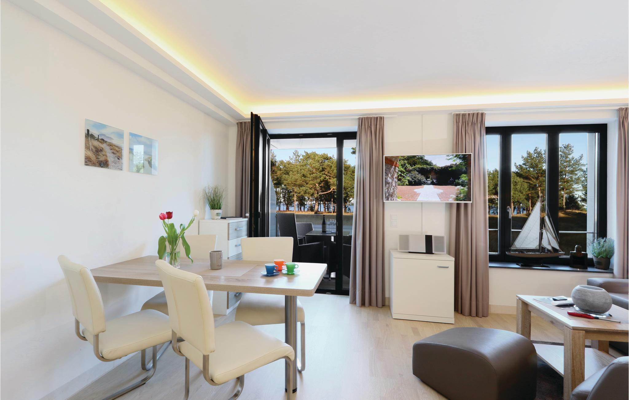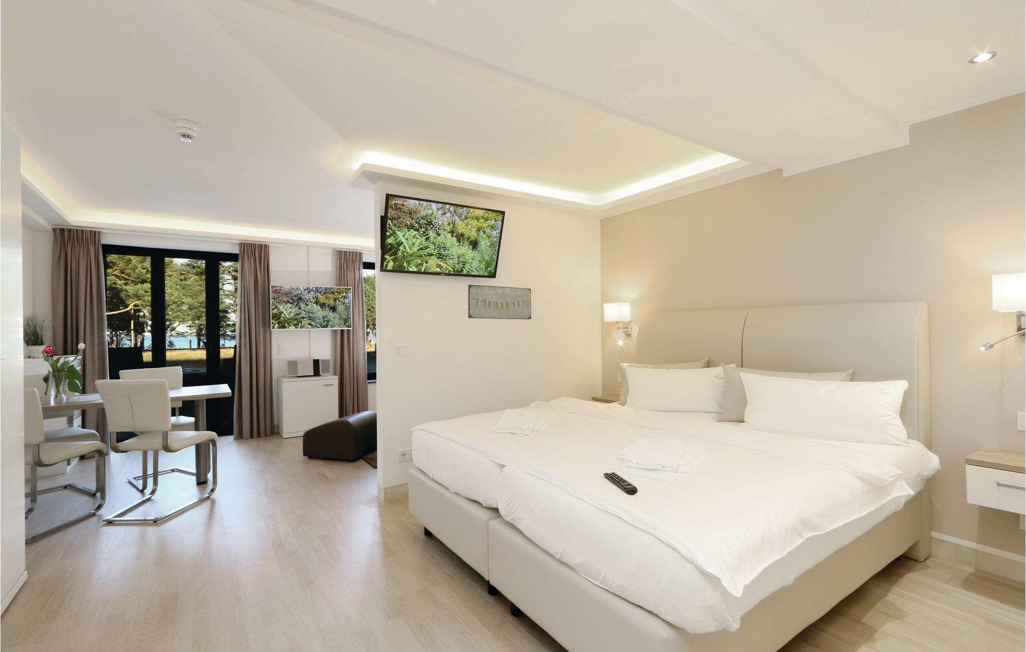 Den eksklusive ettromsleiligheten er det perfekte bostedet for en herlig ferie for to eller fire på den vakre øya Rügen. Leiligheten er smart utformet slik at alt du trenger for en avslappende ferie, er samlet på liten plass: den praktiske kjøkkenkroken med spisebord, et soveområde med en høykvalitets boxfjærseng, et koselig, lyst oppholdsrom og selvfølgelig leilighetens høydepunkt: den private balkongen med utsikt over den parklignende hagen, den rustikke furuskogen og den glitrende Østersjøen bortenfor.