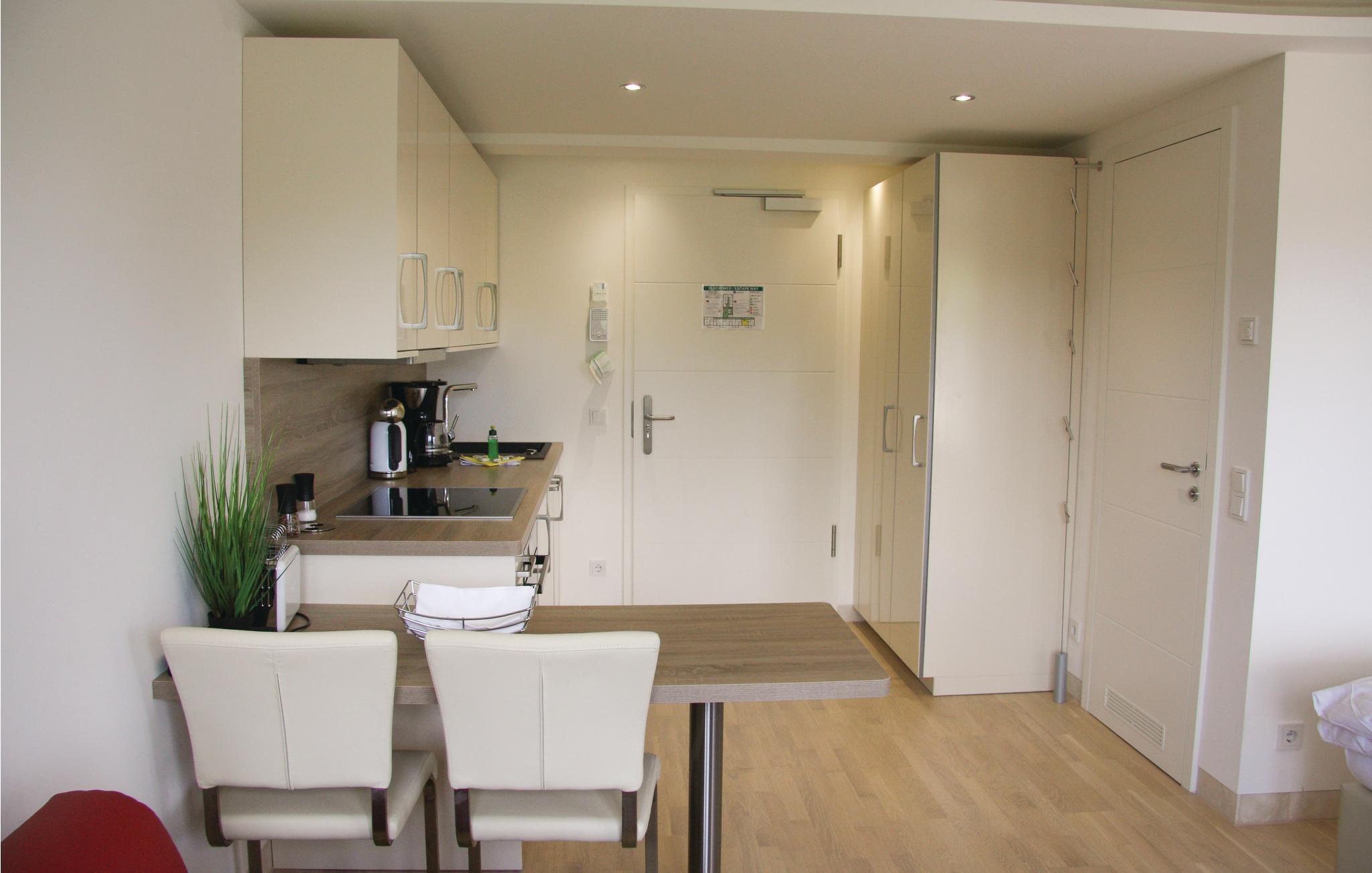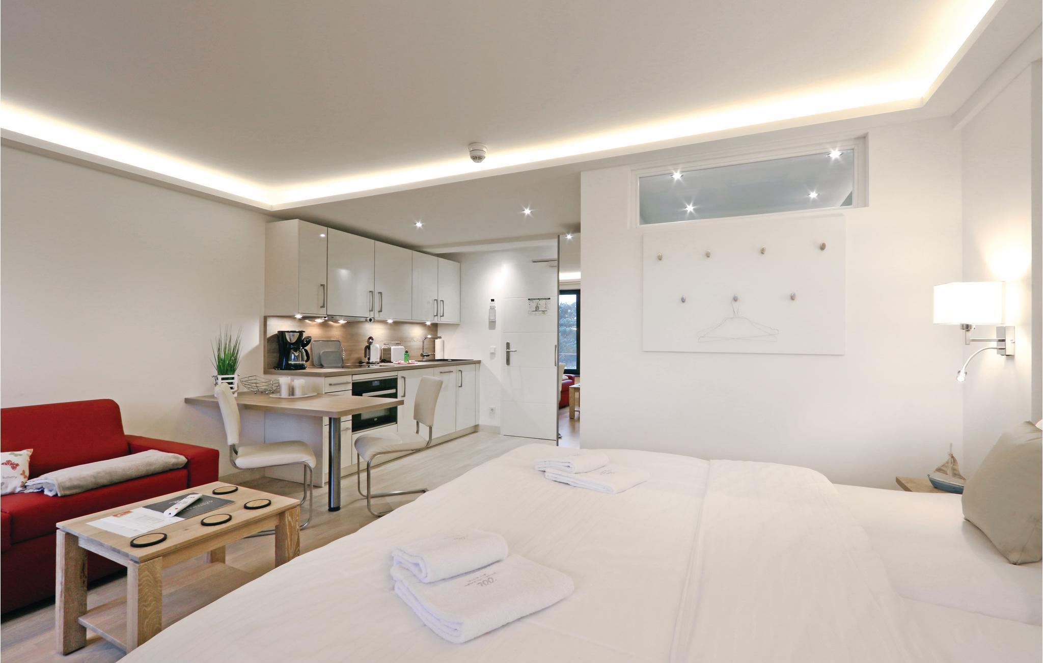 De små studioleilighetene med stor effekt er perfekte for en ferie for to. Her i 3. etasje kan du nyte en fantastisk utsikt over hagen, furuskogen og de glitrende bølgene i Østersjøen. På 28 m2 kan du tilbringe den perfekte ferien ved Østersjøen i denne elegante og moderne leiligheten. En liten kjøkkenkrok er tilgjengelig hvis du ikke ønsker å benytte deg av en av feriekompleksets restauranter og kafeer, men vil tilberede din egen middag eller frokost og kanskje nyte den på den fantastiske lille balkongen som følger med leiligheten. Store panoramavinduer gir rikelig med lys inn i den lyse ettromsleiligheten, og boxfjærsengen av høy kvalitet garanterer en avslappende nattesøvn.