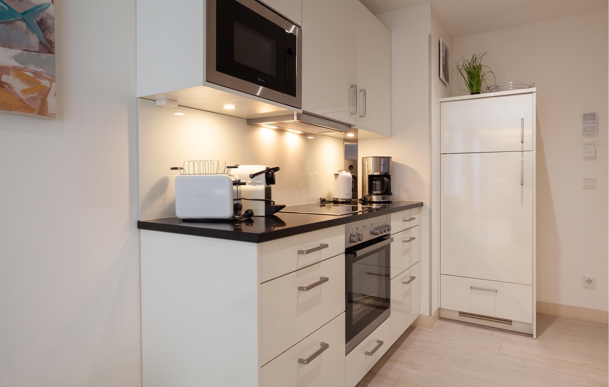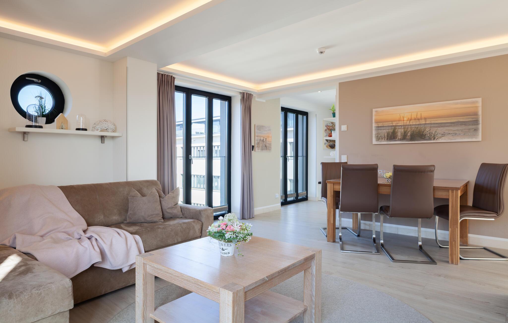 Den moderne leiligheten ligger bare noen få skritt fra den vakre stranden i sidefløyen av den fredede bygningen. Takket være vinduer på tre sider er leiligheten gjennomstrømmet av lys fra morgen til kveld.