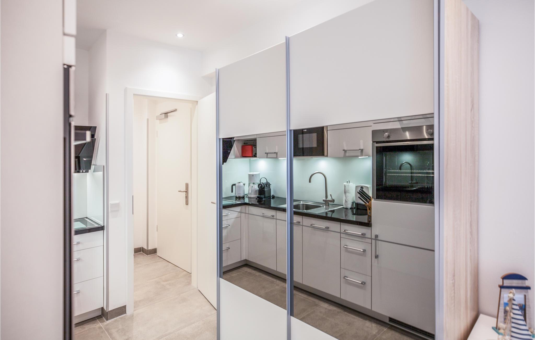 Den høykvalitets og allergivennlige "Panorama Studio" ligger i første etasje og ligger rett ved siden av utendørsbassenget. Du kan spise frokost på terrassen med utsikt over bassenget, og med litt flaks kan du til og med høre lyden av havet mens du nyter de første solstrålene. Ettromsleiligheten kombinerer soving, matlaging og opphold i ett og samme rom. I tillegg til den koselige dobbeltsengen er det en ekstra soveplass på sovesofaen. Kjøkkenkroken er fullt utstyrt med høy standard, slik at du ikke går glipp av noe på ferien. Oppvaskmaskin, fryserom og kaffemaskin er tilgjengelig for deg. Kaffeelskere vil glede seg over den ekstra Nespresso-maskinen (vennligst ta med dine egne kapsler).