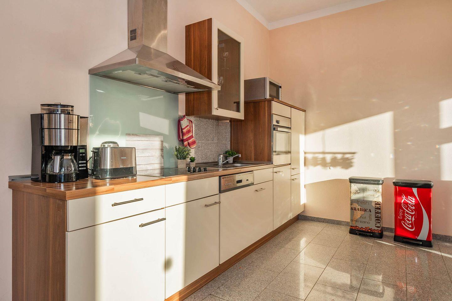 Das Wohnzimmer der Wohnung 01 lässt dank vieler großer Fenster den Raum in hellem, natürlichem Licht erstrahlen. Eine gemütliche Ledercouch, sowie ein Sideboard mit Flachbild-Fernseher sind Teil der Räumlichkeit, sowie die Küchenzeile und ein Esstisch mit Bestuhlung. Das Sofa dient, idealerweise für ein Kind, als weitere Schlafmöglichkeit. In der Küche finden Sie relevante Küchengeräte wie ein Ceranfeld mit vier Platten, einen Backofen, Spülmaschine und Kühlschrank. Haushaltsgeräte wie eine hochwertige Filterkaffeemaschine, Wasserkocher, Toaster und Mikrowelle gehören ebenfalls zur Ausstattung. Vom Wohnbereich gelangen Sie auf die zur Wohnung gehörende Terrasse. Das Schlafzimmer wurde in harmonischer Zusammenstellung mit einem Doppelbett (Liegefläche 1,80 x 2,00 Meter), Nachttischen, Fernseher und Kleiderschrank ausgestattet. Das geräumige Badezimmer verfügt über ein WC, Waschbecken samt Spiegelschrank, eine Eckbadewanne und eine ebenerdige Dusche.
