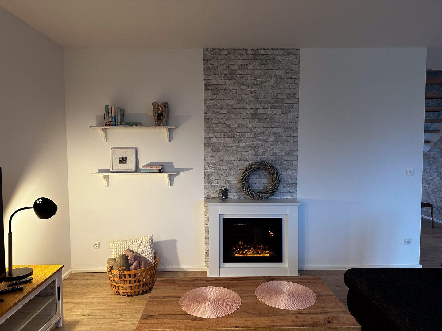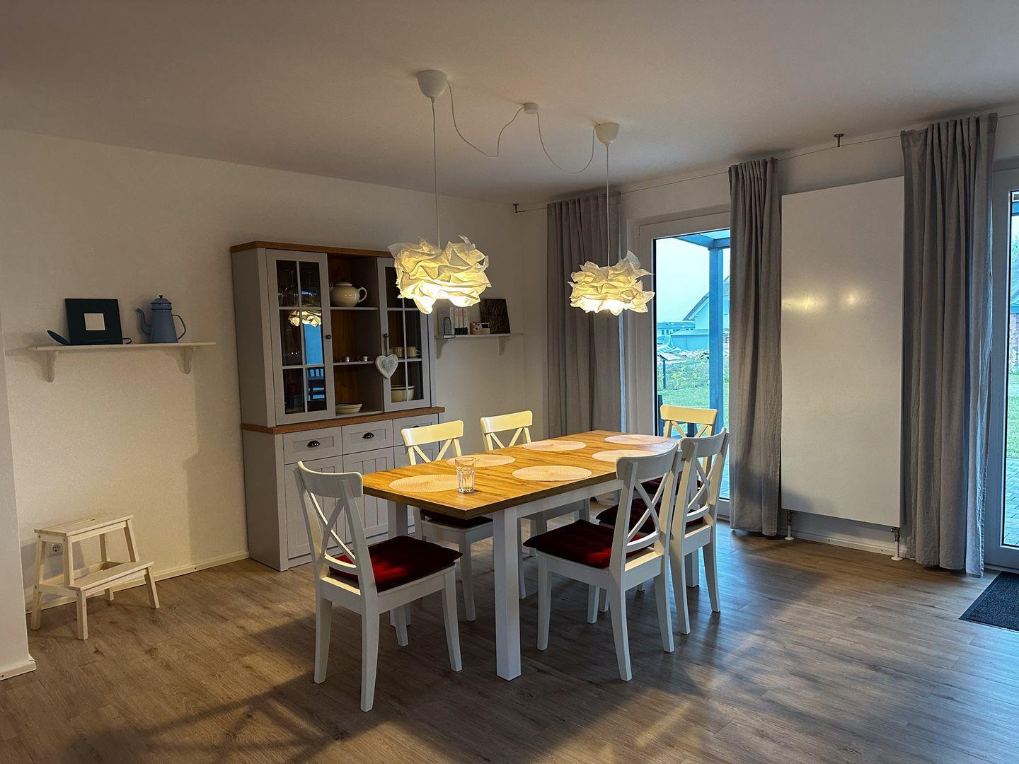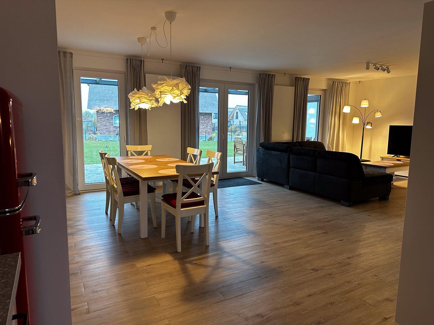 Im luftig und hell gestalteten Erdgeschoss finden Sie den großen Wohn-und Essbereich mit offener, sehr gut ausgestatteter Küche. Für besonderes Ambiente an stürmischen Tagen sorgt der komfortabel zu bedienende Elektrokamin. Die großen Glastüren lassen viel Licht in das Haus und führen auf die überdachte, windgeschützte Südterrasse. Neben bequemen Mobiliar steht Ihnen für den sommerlichen Grillgenuss ein Gasgrill zur Verfügung.