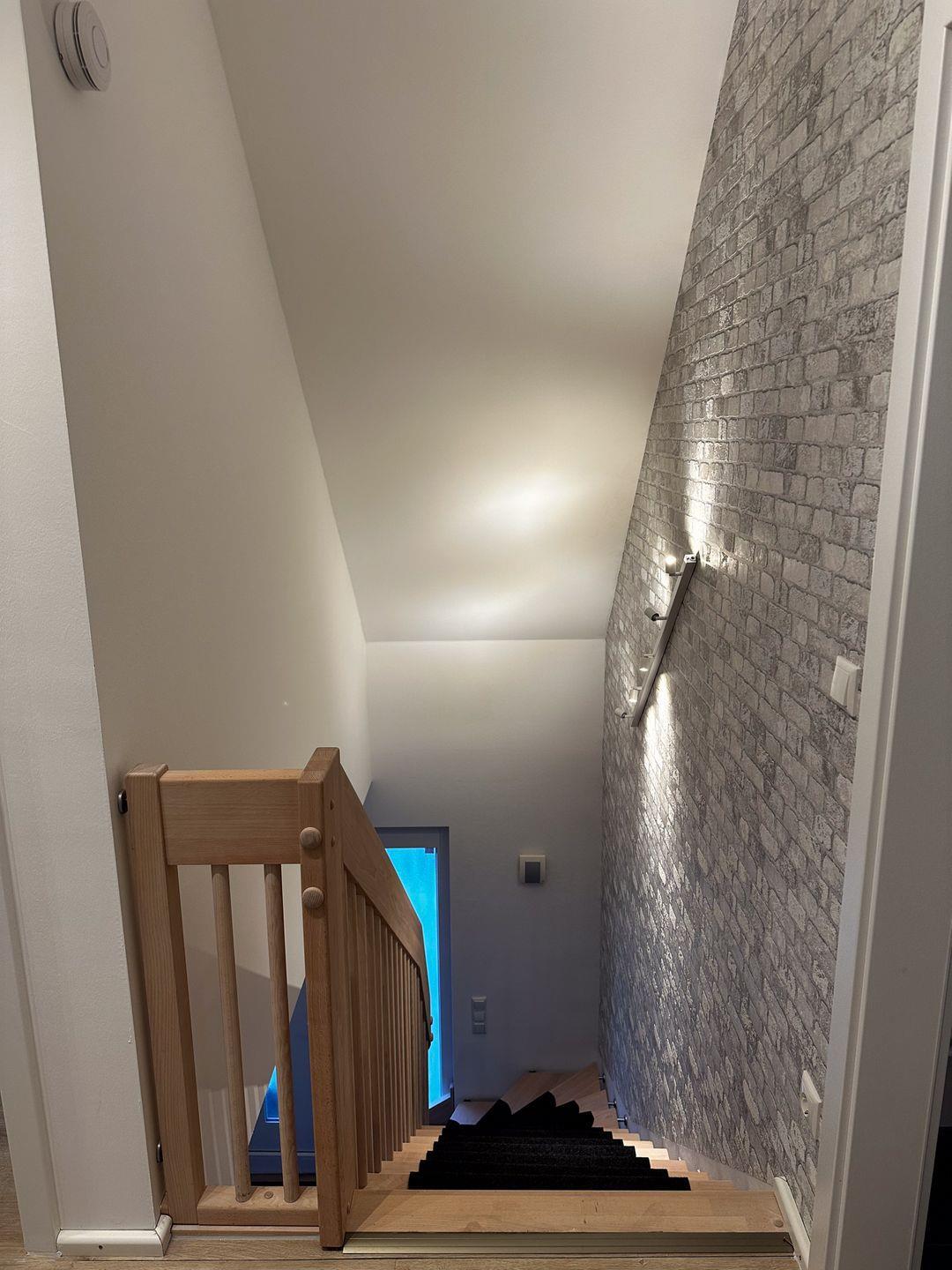 Die drei Schlafzimmer befinden sich im Obergeschoss und verfügen jeweils über ein 1,60 m breites Doppelbett. Das Vollbad mit Wanne und Dusche finden Sie ebenfalls im Obergeschoss. Ein weiteres Bad mit Dusche und ein kleiner Abstellraum befinden sich im Erdgeschoss.