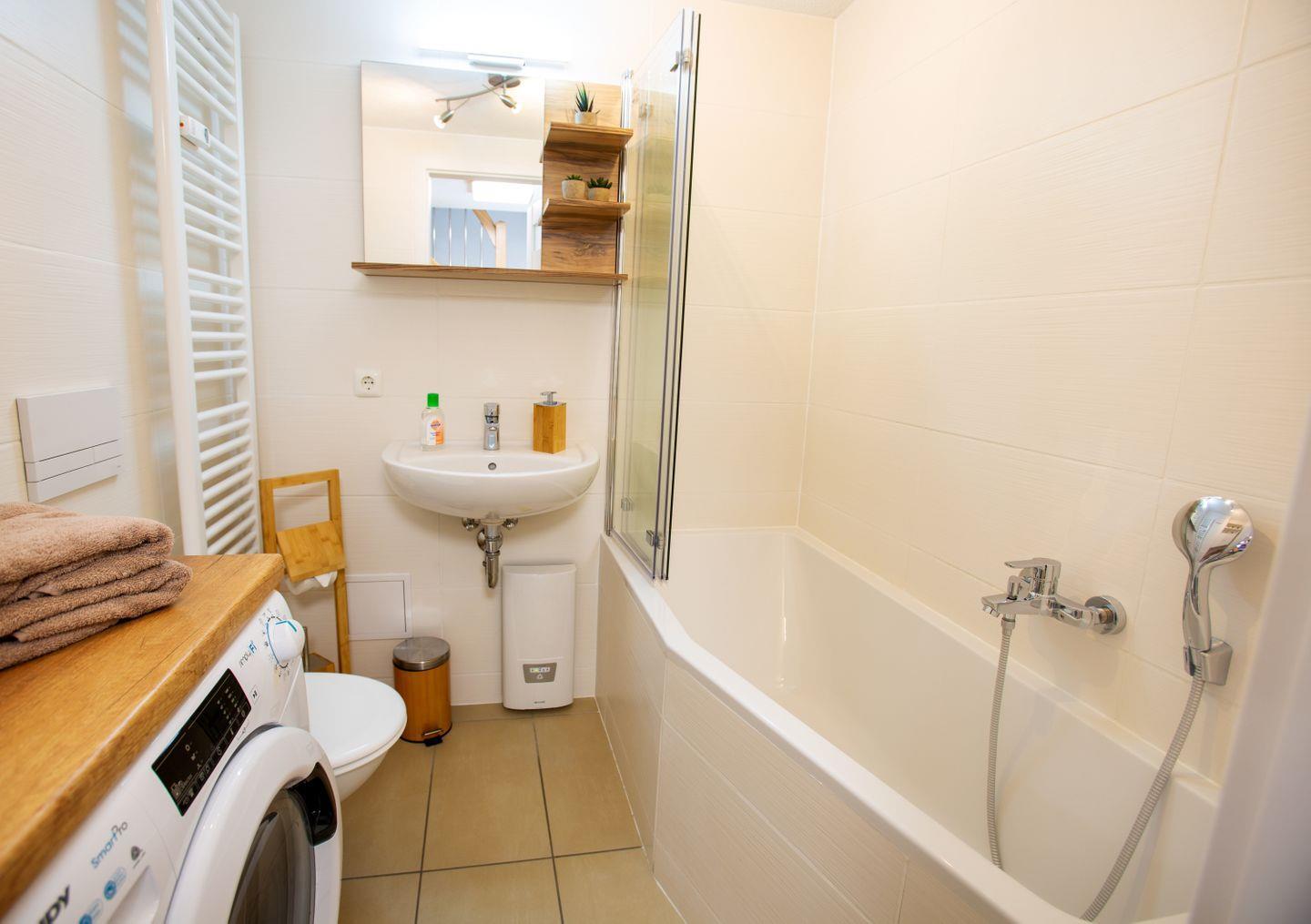 Die Ferienwohnung verfügt über ein Schlafzimmer, ein Badezimmer mit Dusche in der Badewanne sowie ein offenes Wohn- und Esszimmer, das zu geselligen Abenden einlädt. Der stilvolle Essbereich ist perfekt für gemeinsame Mahlzeiten, während das Wohnzimmer mit einer Sofaecke und einem großen TV zum Entspannen einlädt. Genießen Sie Ihre Lieblingsfilme auf einem Fernseher mit einer Größe von 44 bis 55 Zoll, der in dem gemütlichen Wohnzimmer platziert ist. Zusätzlich sorgt die vorhandene Internetverbindung mit einer Geschwindigkeit von ab 25 MBit/s dafür, dass Sie auch während Ihres Urlaubs stets online bleiben können.