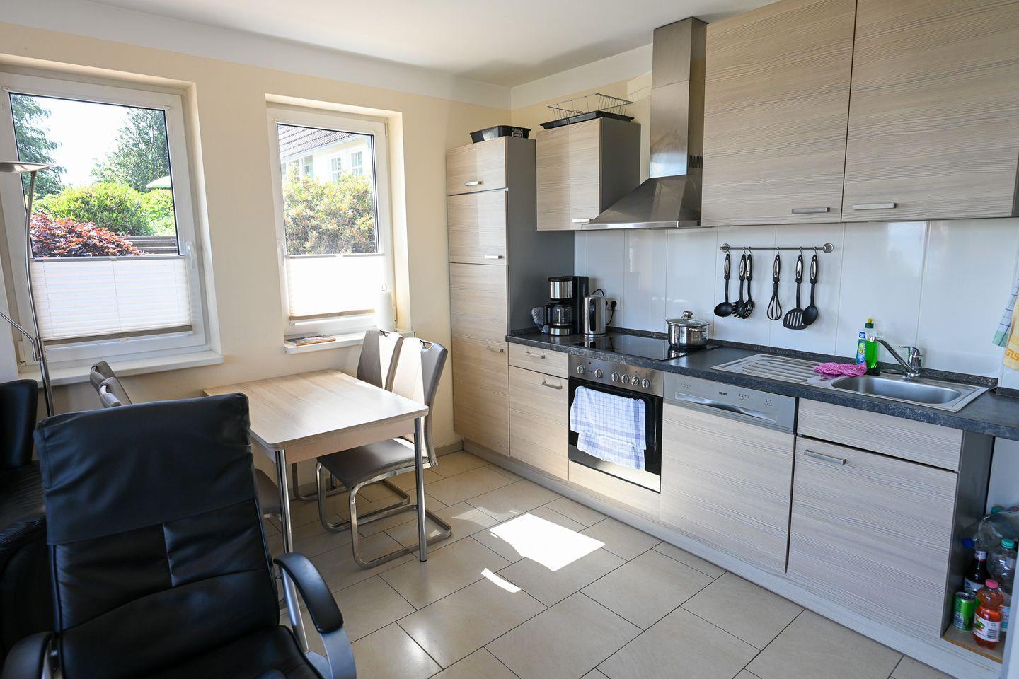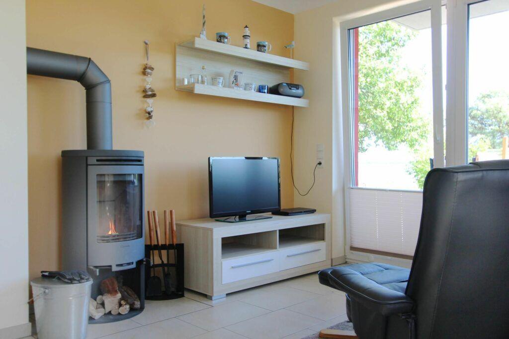 Im Erdgeschoss des Ferienhauses "Boddenblick" untergebracht, bietet diese 3 Zimmer Wohnung auf 50 m² Platz für bis zu vier Personen. Das Herz der Ferienwohnung bildet der gemütliche Wohnbereich mit voll ausgestatteter Küchenzeile. Bei Schietwetter machen Sie es sich auf der Couch bequem und genießen die wohlige Wärme des Kaminofens. Durch die Terrassenfenster bietet sich ein traumhafter Blick über den Greifswalder Bodden zur Insel Vilm.