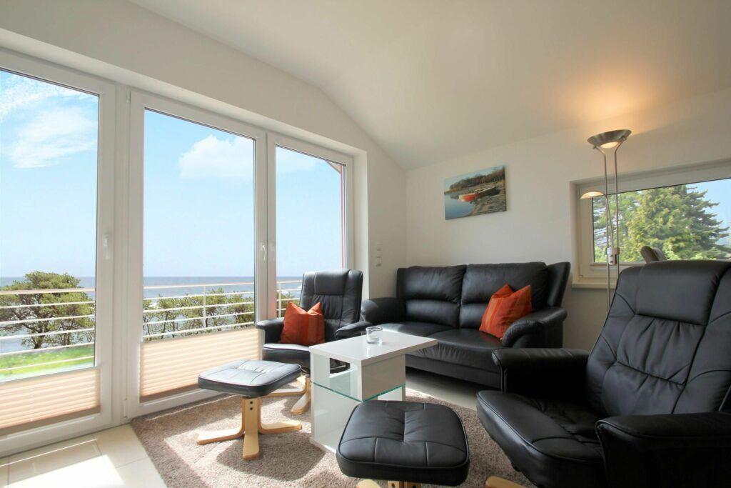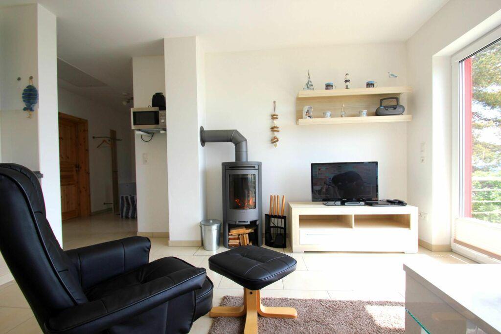 Im Obergeschoss des Ferienhauses "Boddenblick" untergebracht bietet diese 3 Zimmer Wohnung auf 50 m² Platz für bis zu vier Personen. Das Herz der Ferienwohnung bildet der gemütliche Wohnbereich mit voll ausgestatteter Küchenzeile. Bei Schietwetter machen Sie es sich auf der Couch bequem und genießen die wohlige Wärme des Kaminofens. Durch die bodentiefen Terrassenfenster bietet sich ein traumhafter Blick über den Greifswalder Bodden zur Insel Vilm.