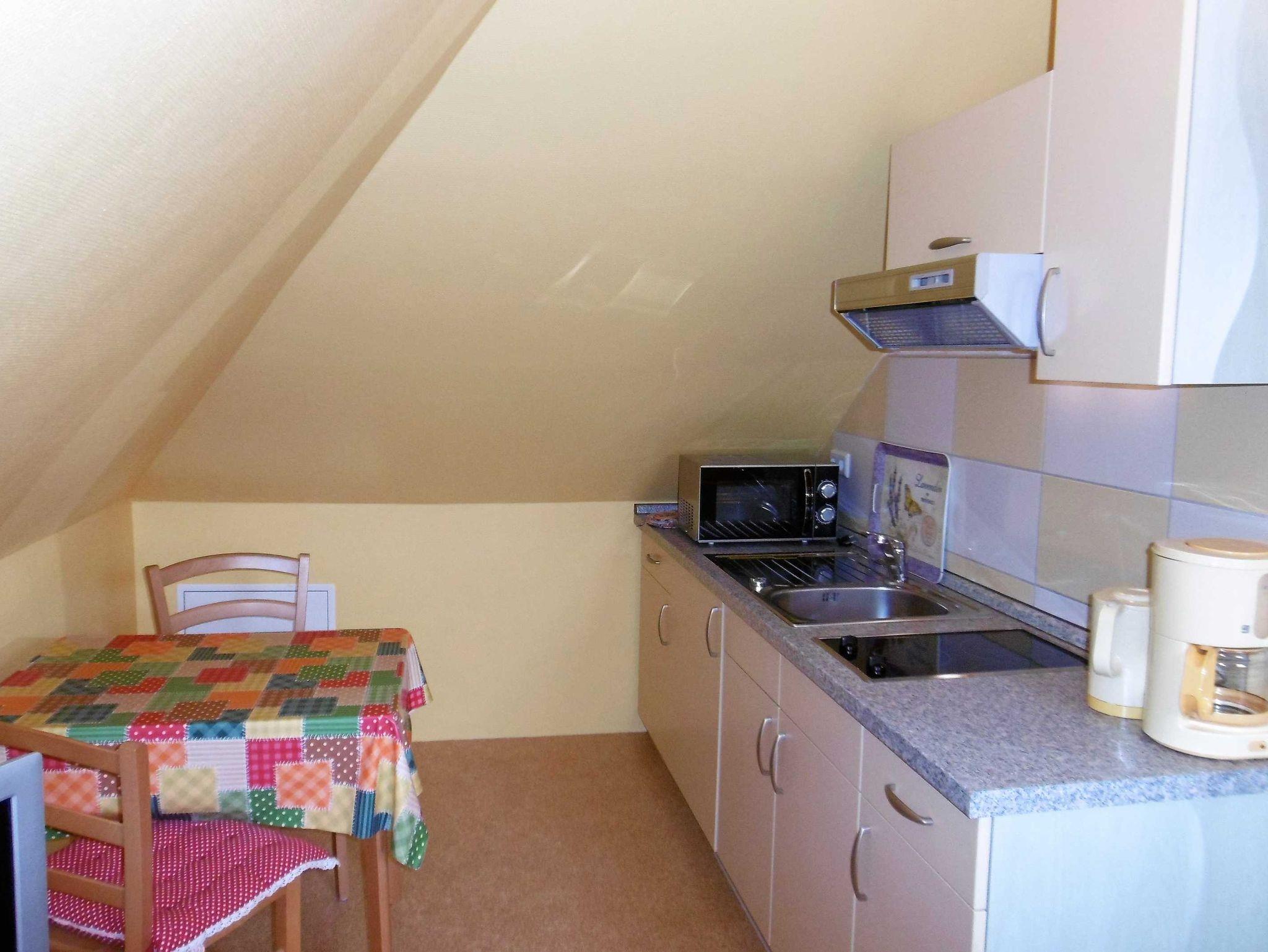 Die Ferienwohnungen bestehen aus je einem kombinierten Wohn-Schlafraum mit offener Küche mit Esstisch und dem Duschbad.