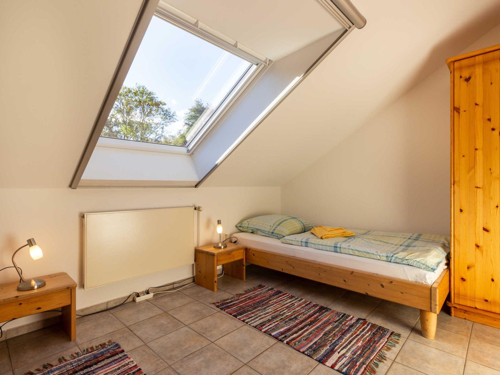 Im ebenfalls hellen, freundlichen Obergeschoss gibt es zwei Schlafräume. Diese sind jeweils mit zwei Betten (vier Betten pro Ferienwohnung) ausgestattet. Ein Schlafraum ist ein Durchgangszimmer (zur Treppe offen - siehe Grundriss). Beide Räume verfügen über große Dachfenster, die abgedunkelt werden können.