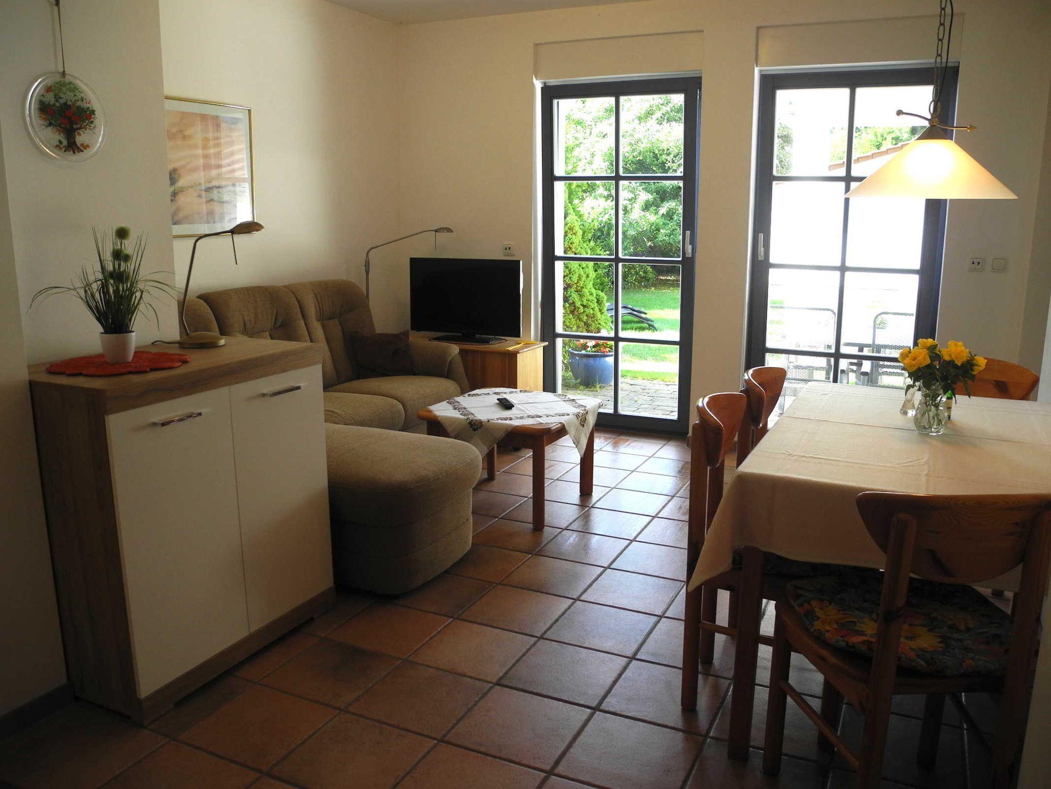 Diese Wohnung befindet im Erdgeschoss und verfügt über einen Wohnraum mit einer integrierten Einbauküche, Essplatz und Eckcouch, einem Elternschlafzimmer mit einem Doppelbett, einem Kinderzimmer mit einem stabilen Etagenbett, Dusche/WC sowie einer halbüberdachten Terrasse, die direkt in den großen Garten führt.