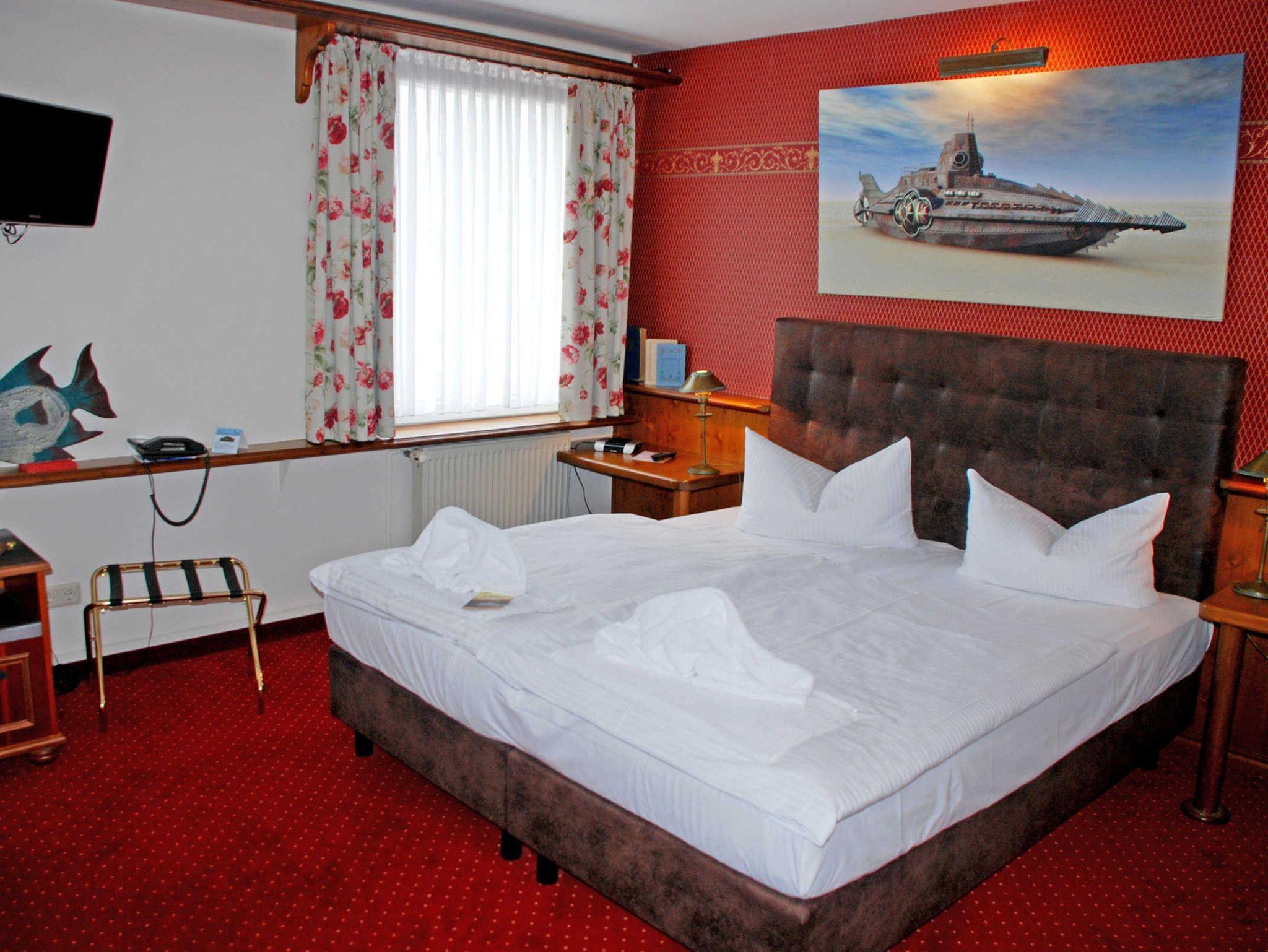 Alle Zimmer sind maritim, passend zum Thema U- Boot, gestaltet. Während die Doppel- und Einzelzimmer im Haupthaus liegen, befinden sich die Kapitänssuiten in 2 separaten Gästehäusern und sind über die einzelnen Terrassentüren separat von außen zu begehen. Die Wohnzimmer im Paterre sind unter anderem mit TV, Telefon und Minibar ausgestattet. Ebenfalls im Paterre befindet sich das Bad mit Dusche und WC. Über eine Holztreppe geht es in den Schlafbereich. Jede Kapitänssuite verfügt über eine eigene Terrasse. Weitere Angaben finden Sie bei der Detailbeschreibung der Hotelzimmer.