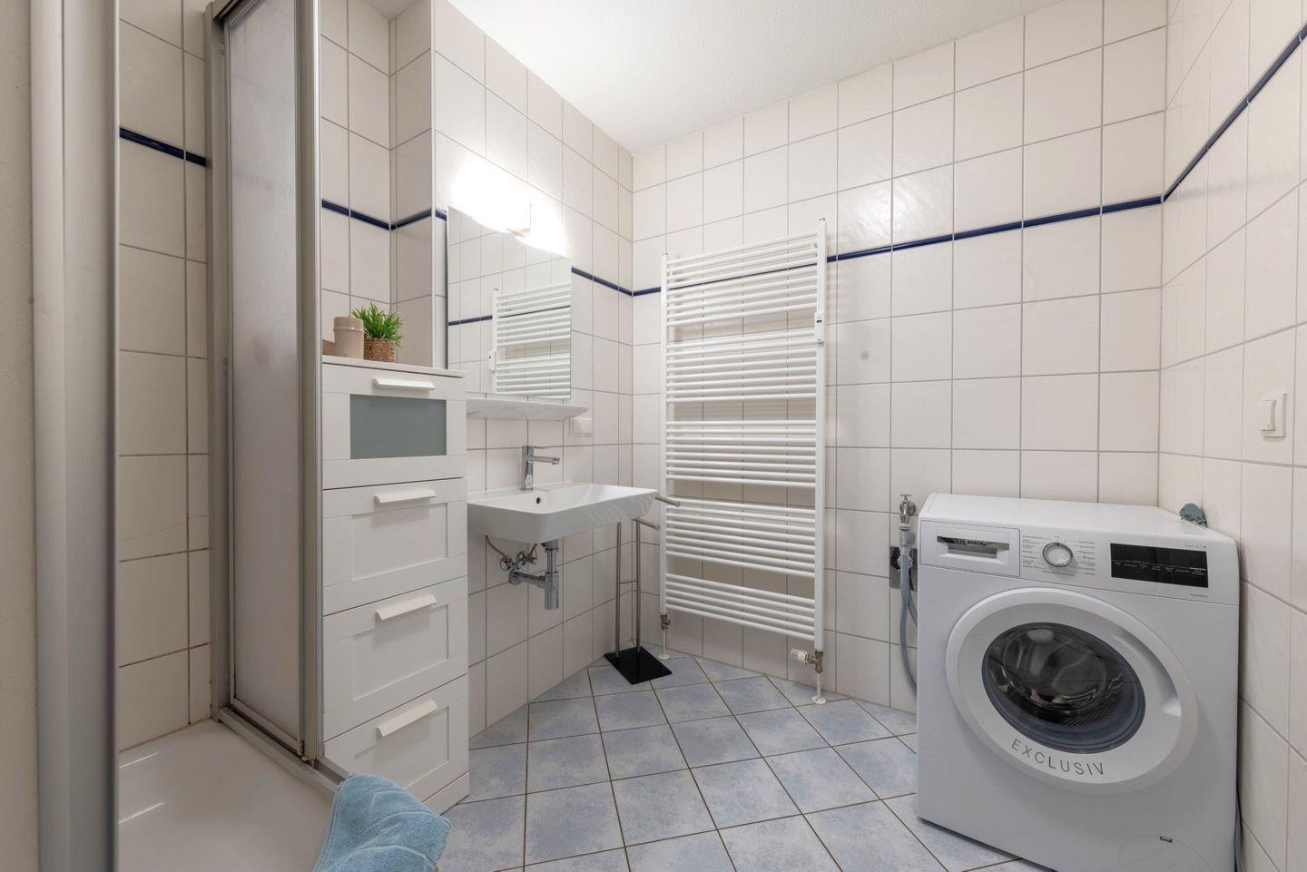 Das Badezimmer ist mit Dusche, WC und Föhn ausgestattet und bietet alles, was Sie für einen angenehmen Aufenthalt benötigen. Ergänzt wird die Ausstattung durch einen Ganzkörperspiegel, Staubsauger und eine Waschmaschine zur Eigennutzung.