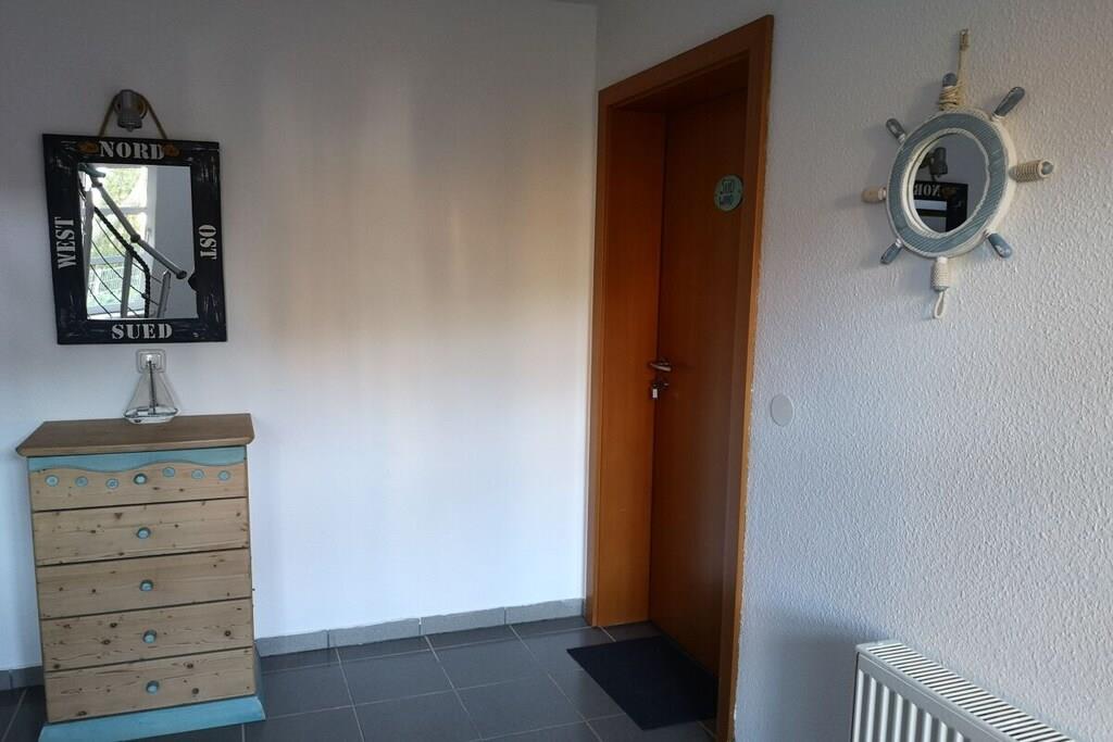 Den vakre, ca 50 m² store leiligheten Südwind har en lys stue med utgang til terrasse, et nordvendt soverom og et delvis åpent kjøkken med en hyggelig spiseplass. Et moderne dusjrom fullfører leiligheten. Med sofaen i stuen tilbyr ferieleiligheten plass til 2 til 3 personer. Til leiligheten hører også en parkeringsplass foran huset. Det er også en låsbar bod på eiendommen for oppbevaring av sykler.