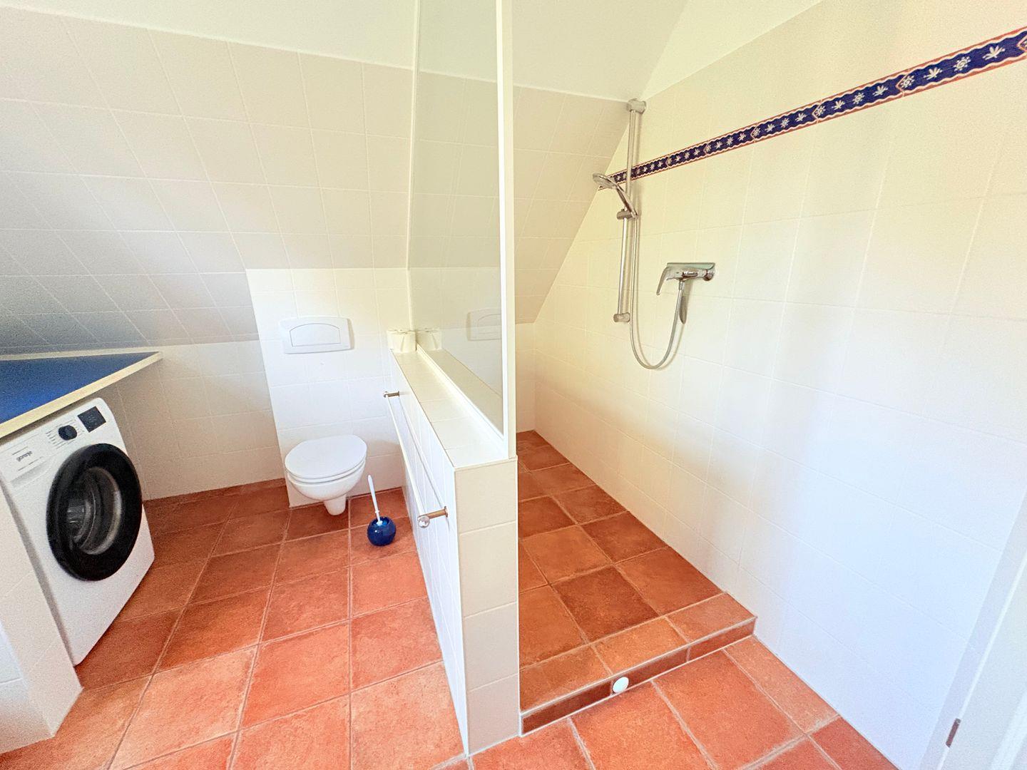 Im OG befindet sich das größere Badezimmer mit begehbarer Dusche, WC und großzügigen Ablageflächen (auch als Wickeltisch nutzbar). Weiterhin steht Ihnen hier auch eine Waschmaschine zur Verfügung.