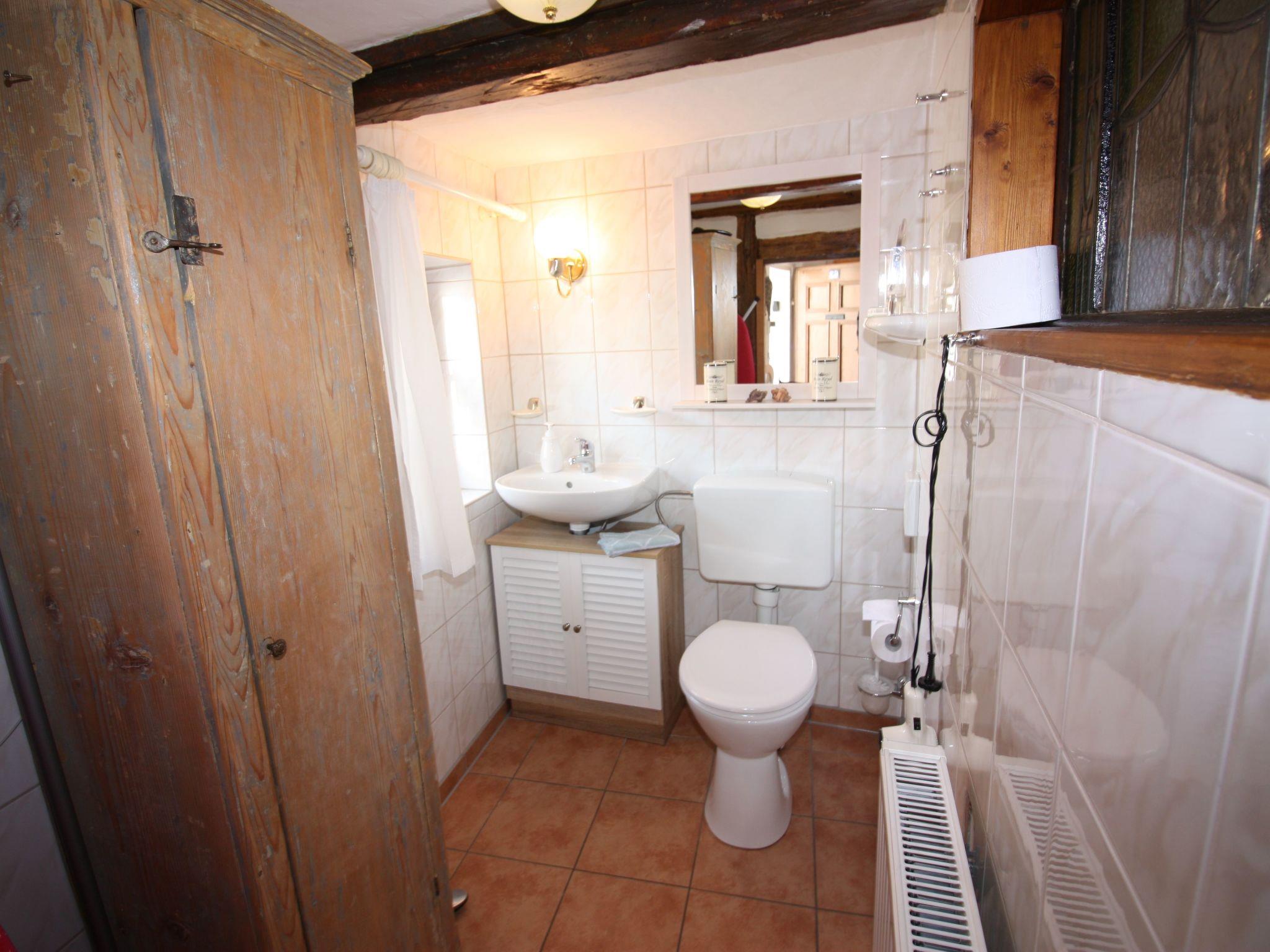 The house offers the authentic ambience of the old timber-framed houses on Münzenberg. Timber framework and sandstone walls, in harmony with the timeless furnishing in a rustic country style, make this house something quite special. Where else would you find a food trough in the living room and a ring for tieing donkeys or goats? Animals and people often lived under one roof in the past, because of a lack of space. The ground floor has a hallway with a light kitchen leading off it with a dining table, a cosy living room, and a little bathroom with a shower, as well as an additional guest WC. The upper floor has two romantic bedrooms with a double bed (1x 140x200 cm u. 1x 180x200cm). A free cot can be provided.