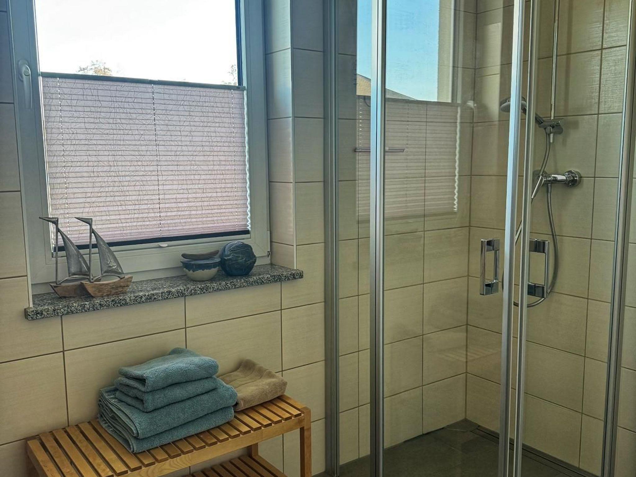 Im modernen Badezimmer erwartet Sie eine ebenerdige Dusche sowie ausreichend Platz für Ihre persönlichen Dinge.