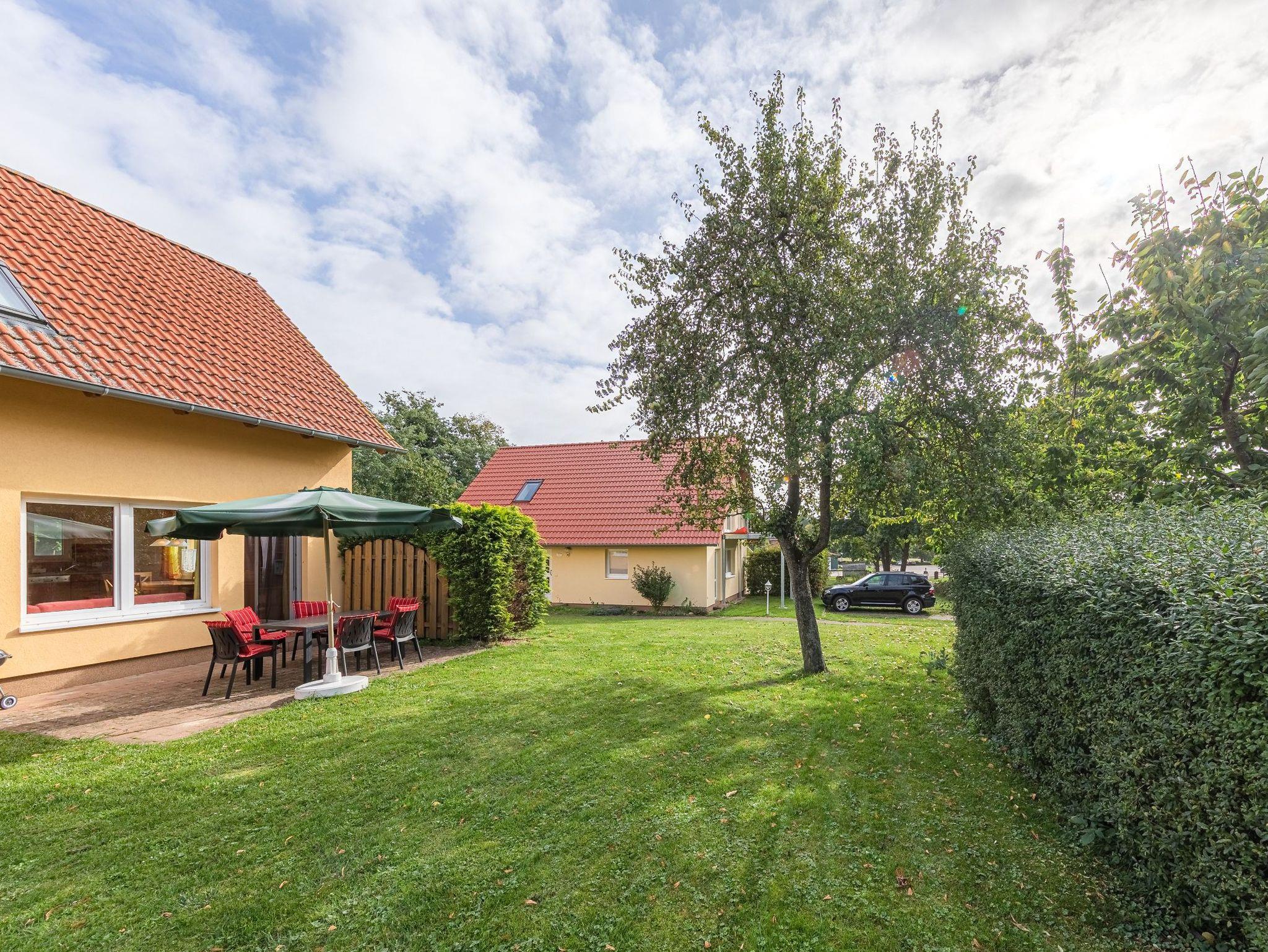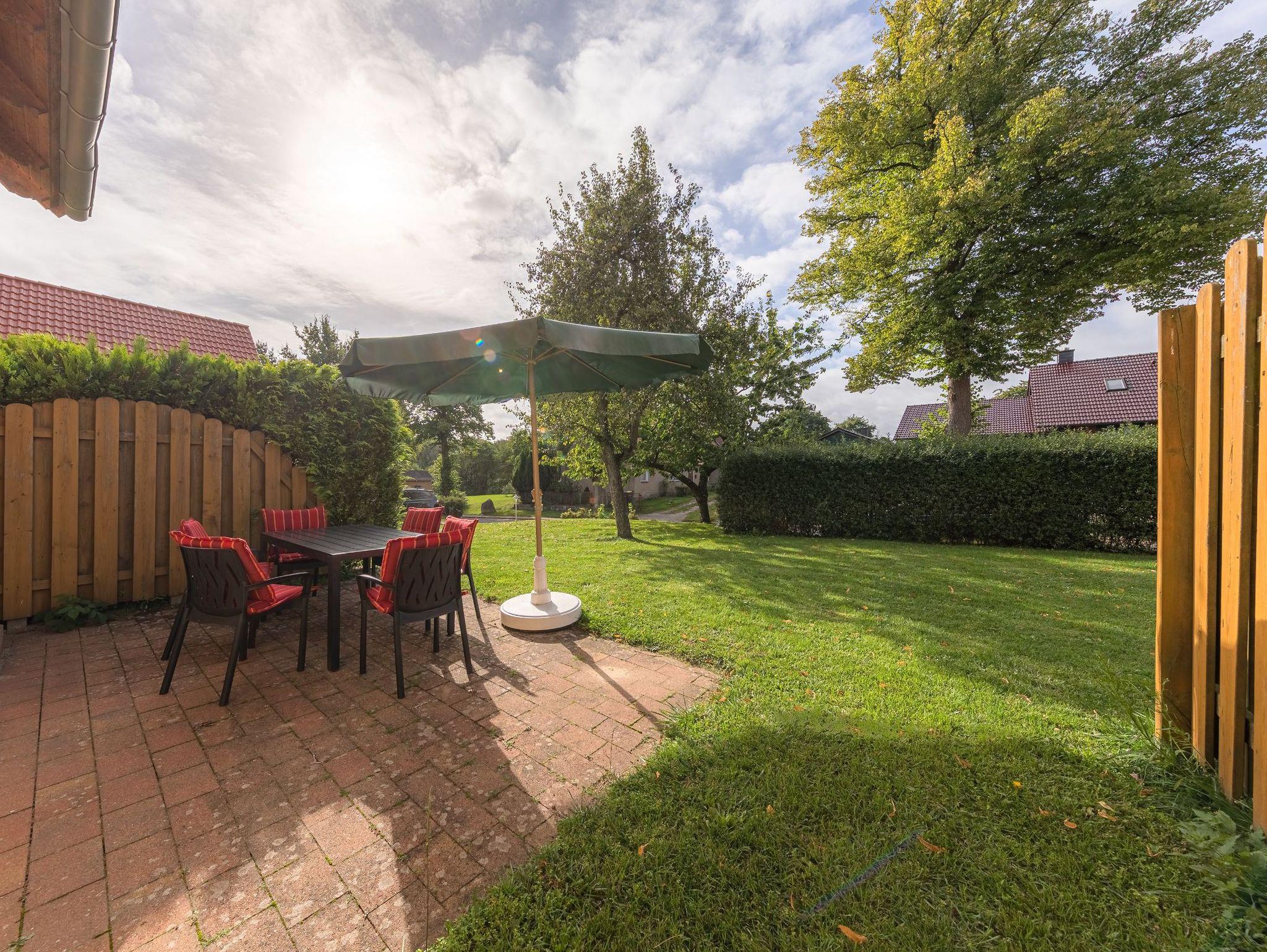 Vom Wohnbereich aus gelangen Sie auf die Terrasse. Diese ist mit Gartenmöbeln, einem Grill sowie einem Sonnenschirm ausgestattet. Der Garten ist von hier frei zugänglich.