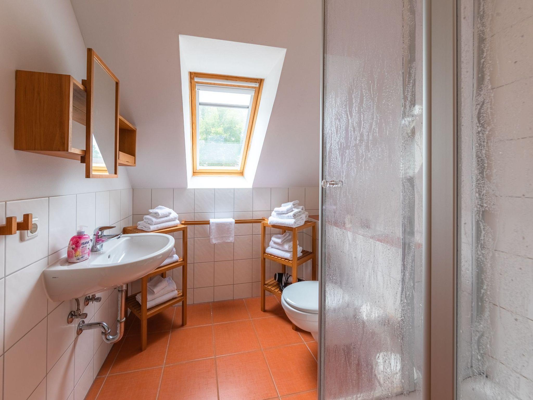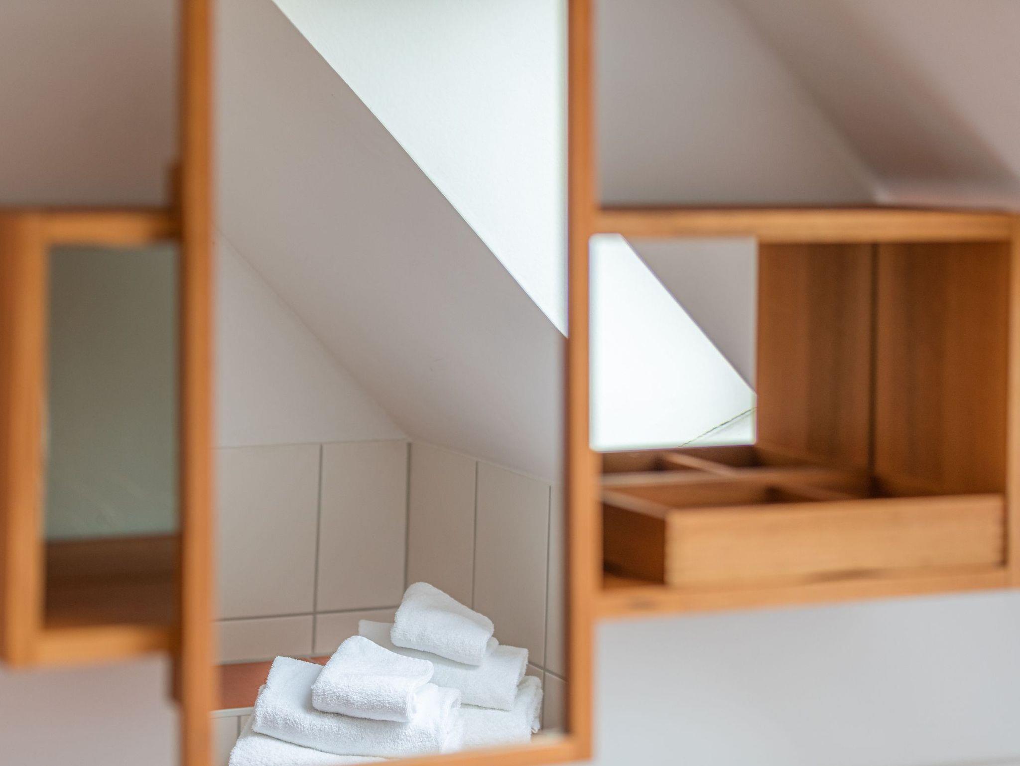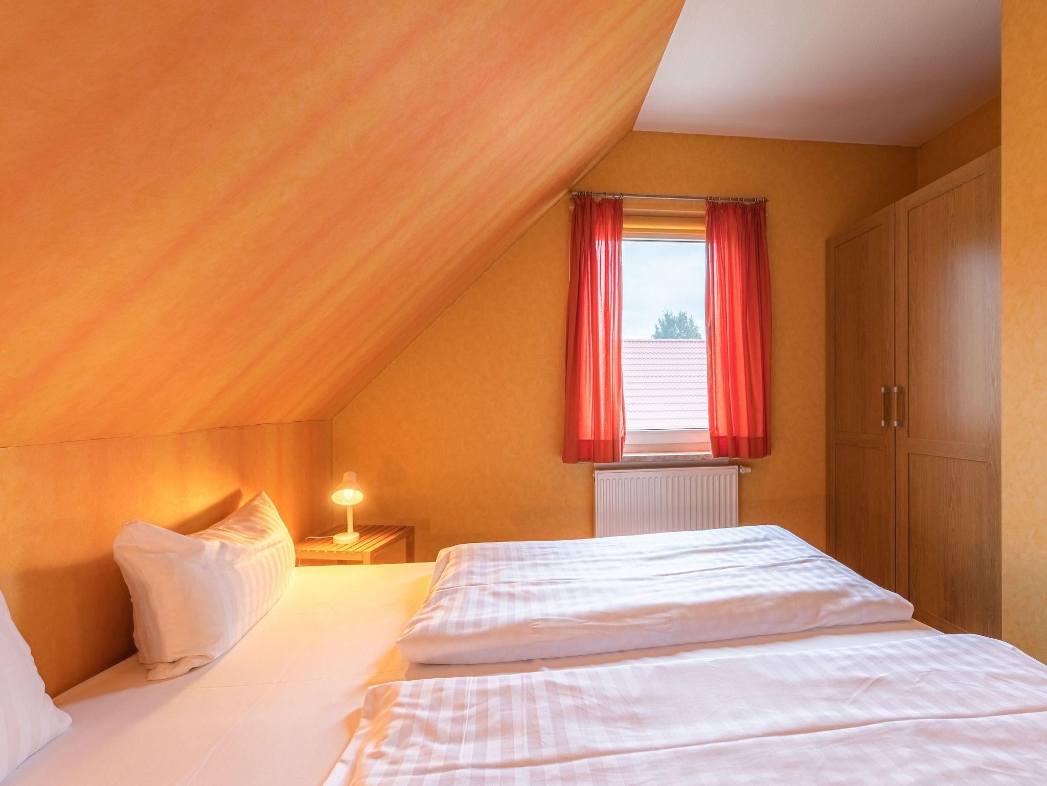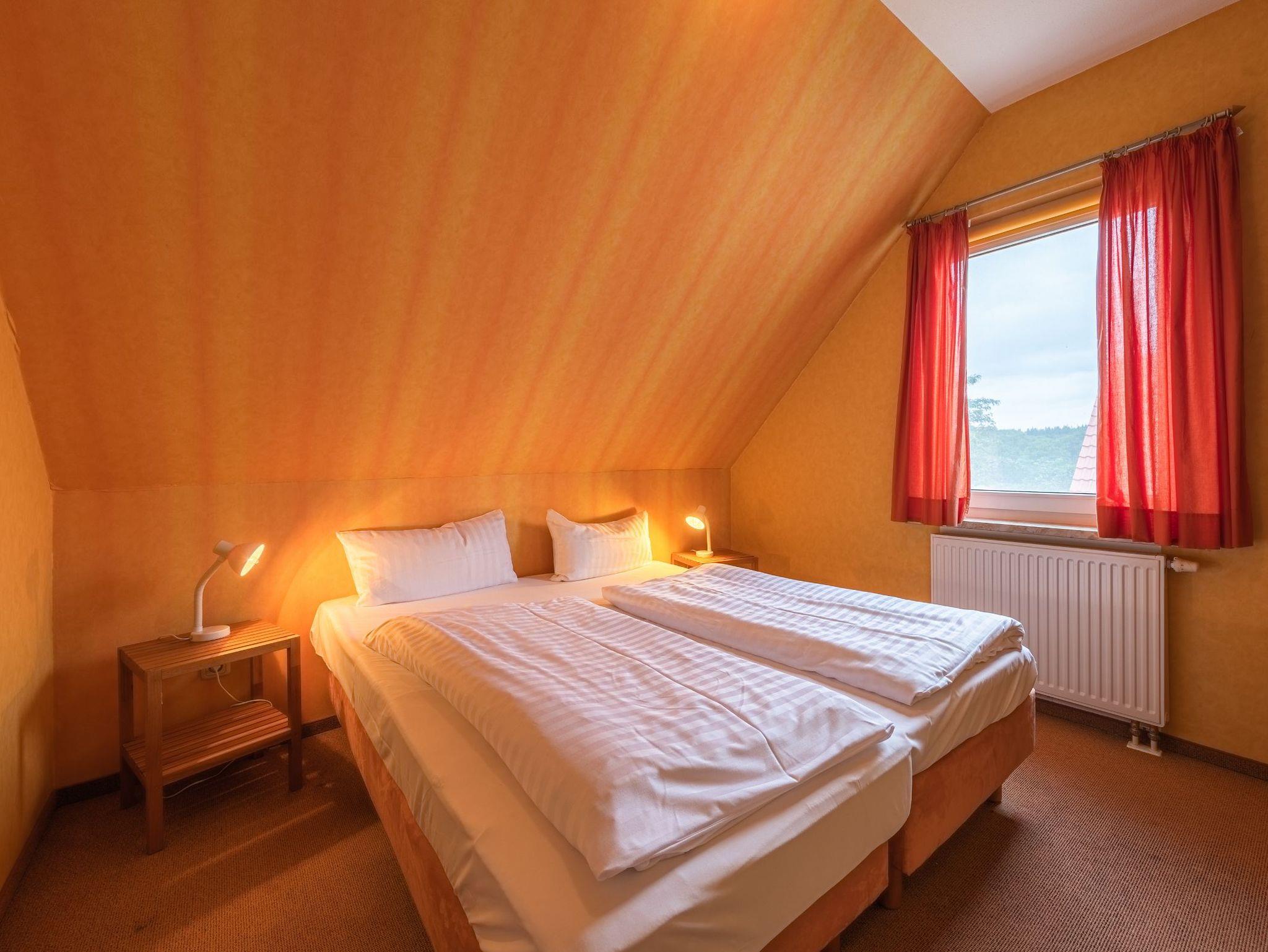 Im Obergeschoss des Ferienhauses an der Müritz befinden sich drei Schlafzimmer sowie das Bad mit Dusche und WC. Neben einem Zimmer mit Doppelbett sowie einem Zimmer mit einem Etagenbett können die Betten im dritten Raum entweder einzeln oder aber als Doppelbett gestellt werden.