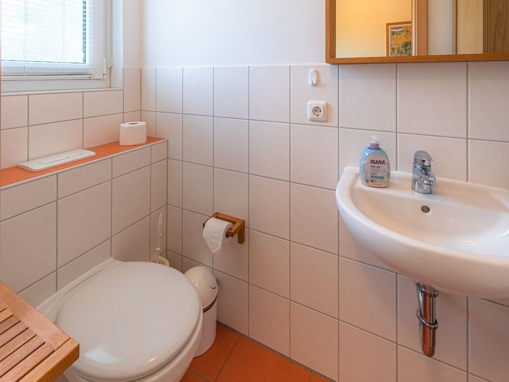 Im Erdgeschoss befindet sich neben dem Eingangsbereich mit Garderobe ein Gäste-WC. Im lichtdurchfluteten Wohnraum stehen ein Essplatz mit großem Tisch sowie ein gemütliches Ecksofa zur Verfügung. Außerdem gibt es einen Fernseher mit SAT-Empfang sowie ein Radio mit CD-Spieler.