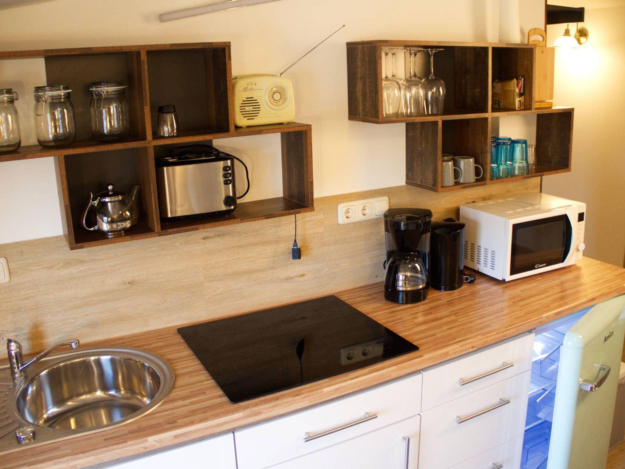 • 1 voll ausgestattete Küche (Wasserkocher, Kaffeemaschine, Mikrowelle, Toaster, Geschirrspüler, Herd, Backofen, Kühlschrank)