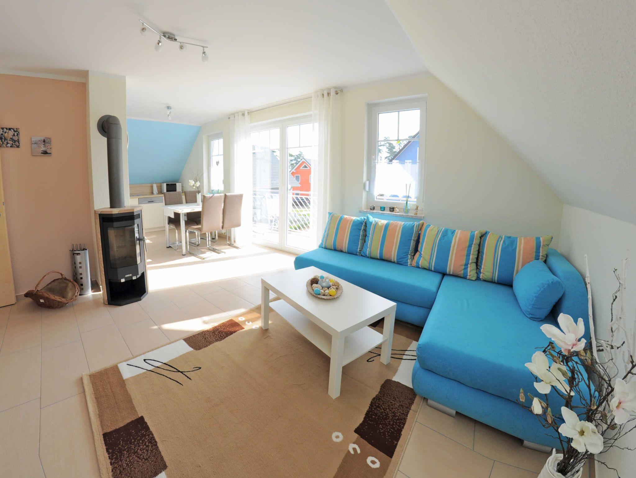 Die bekannte 3 Zimmer Obergeschoss - Ferienwohnung im Ferienhaus Müritzcharme verfügt über 2 Schlafzimmer, 1 Wohn- und Essbereich, Kamin (hier stellt der Vermieter das Brennholz kostenfrei), TV, Balkon sowie eine Infrarot-Sauna im Duschbad runden die Ausstattung der geschmackvoll eingerichteten Ferienwohnung ab. Die rund 60 qm große Ferienwohnung kann mit bis zu 4 Personen belegt werden.