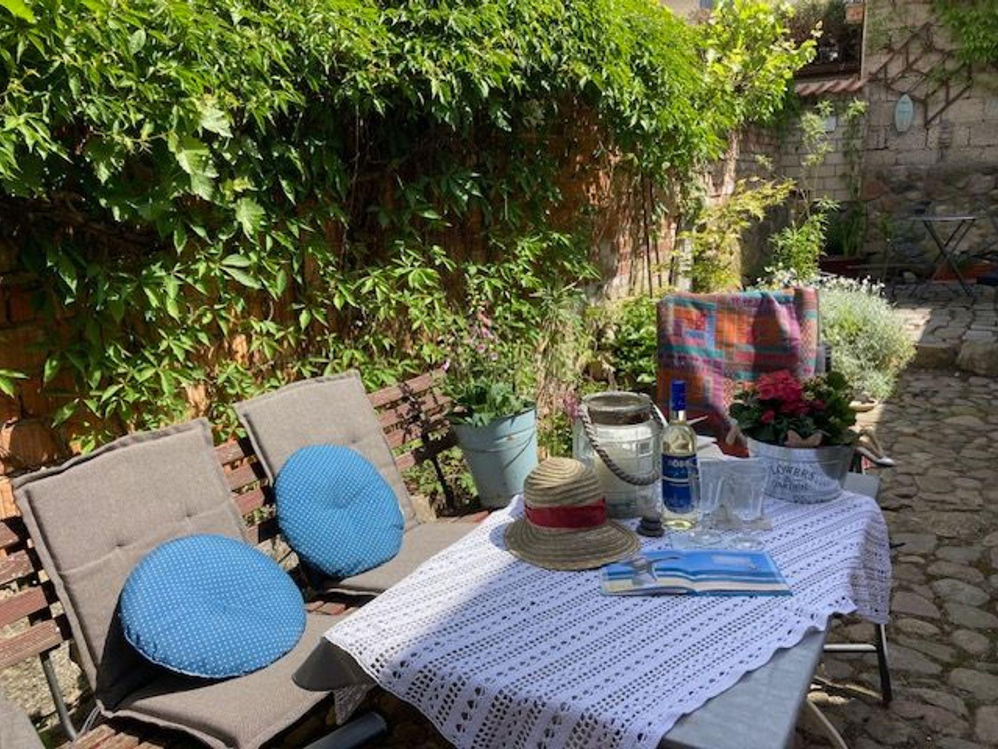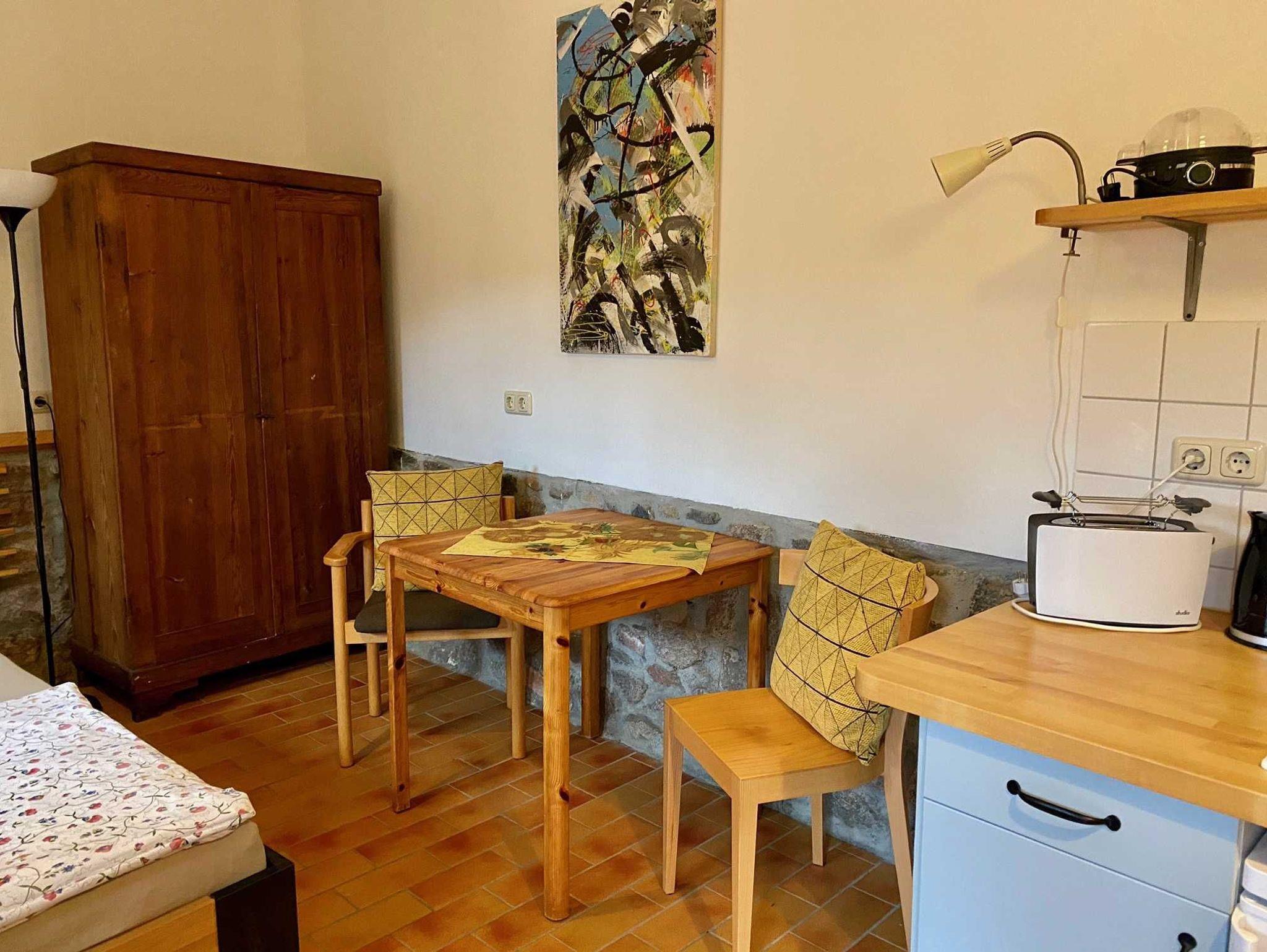 Der kombinierte Wohn/Schlafraum ist ausgestattet mit einem Doppelbett, einer Sitzmöglichkeit, einer Küche die offen zum Wohn - und Schlafbereich ist und einem Bad mit Dusche und WC. Der begrünte Innenhof mit seinen Sitzmöglichkeit bietet den Gästen Ruhe und Entspannung.Hier können Sie auch grillen.