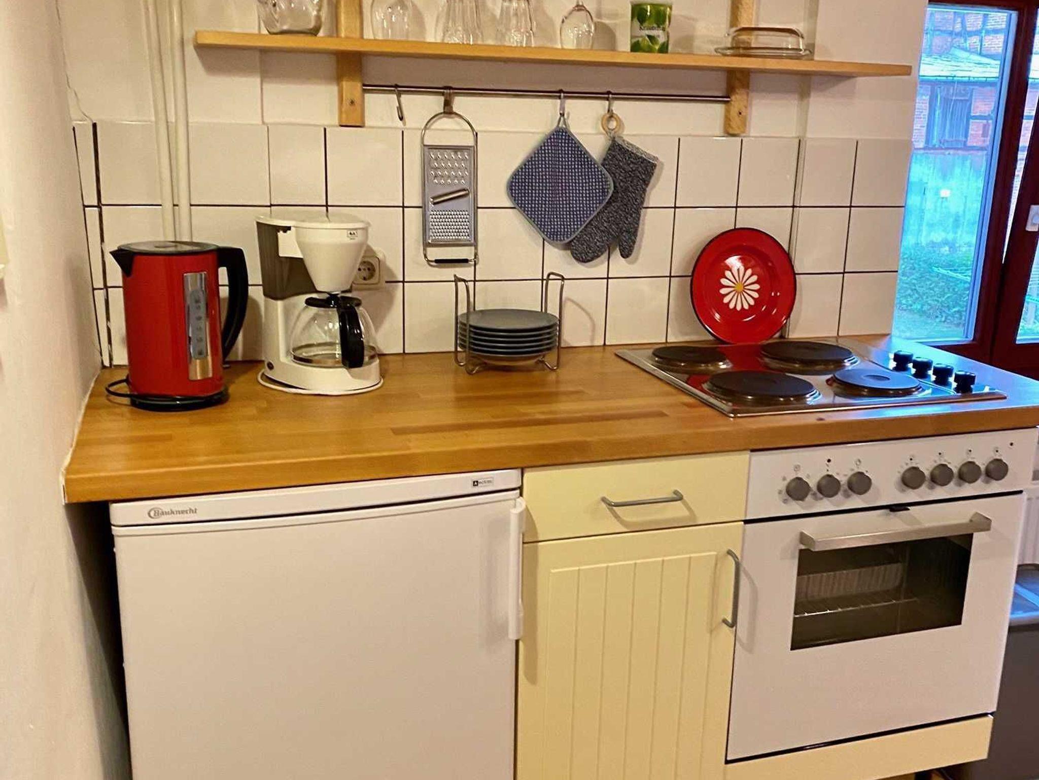 Küche mit Herd und Backofen, Kaffeemaschine, Wasserkocher, Eierkocher und Toaster.