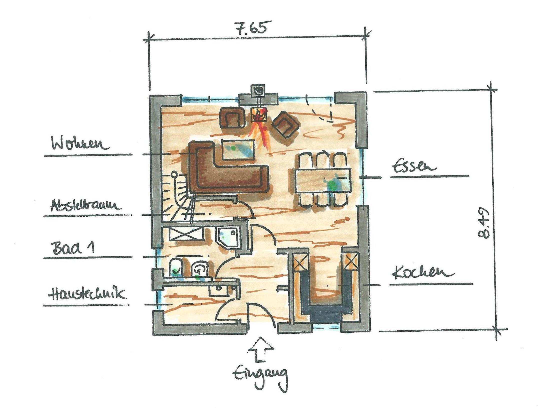 Im Wohnraum gibt es eine Aufbettungsmöglichkeit für 1 Person auf einer Schlafcouch. Zum Wohnraum hin gibt es eine offene komplett ausgestattete Küche mit Geschirrspüler, E-Herd mit Ceranfeld u. Backofen, Mikrowelle, Kaffeemaschine, Toaster, Wasser- u. Eierkocher, Kühl-/Gefrierschrank.