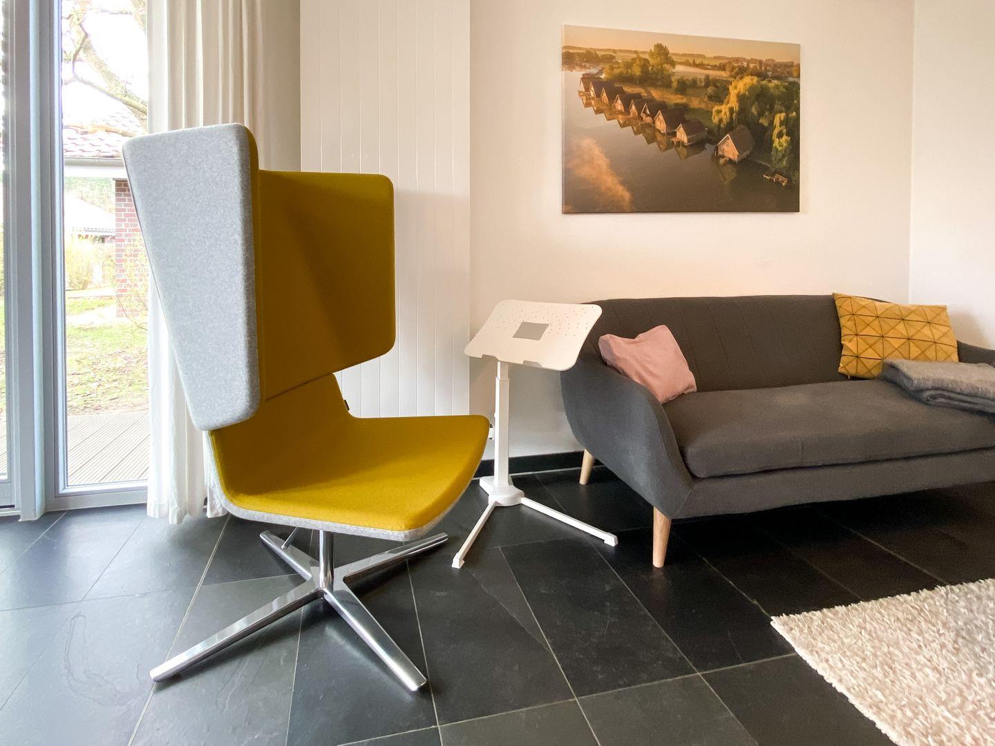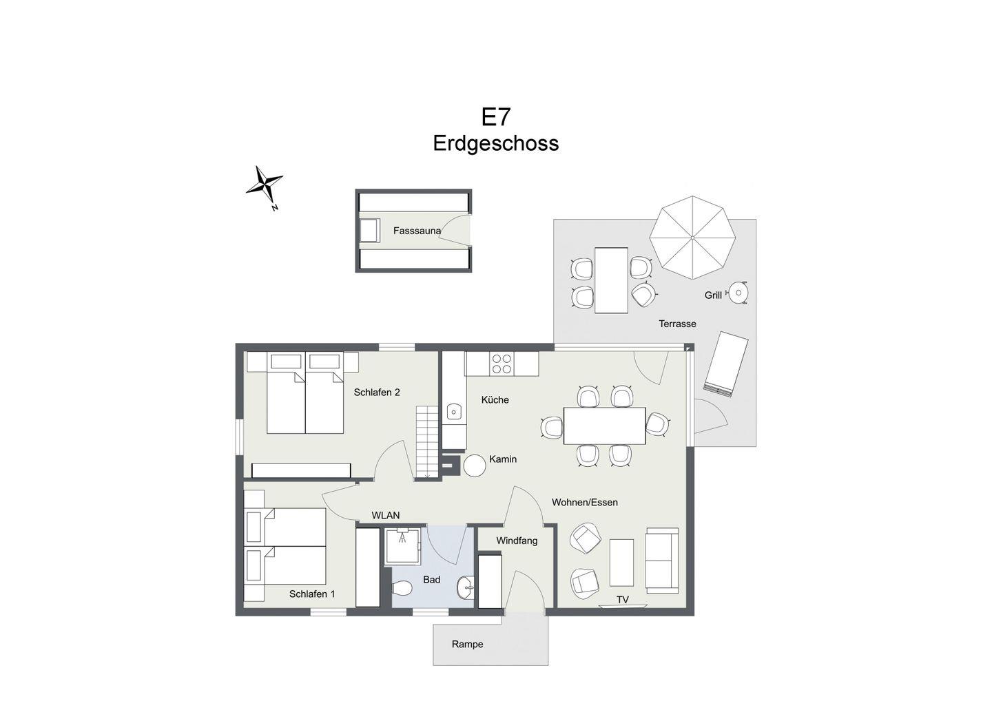 Im Außenbereich erwartet Sie eine großzügige, umlaufende Terrasse, die Ihnen zu jeder Tageszeit einen Platz mitten in der Natur bietet. Für Ihr privates Wellnesserlebnis steht Ihnen eine eigene Fasssauna zur Verfügung, die einen direkten Blick in den Garten gewährt – ideal für ruhige und entspannte Stunden.