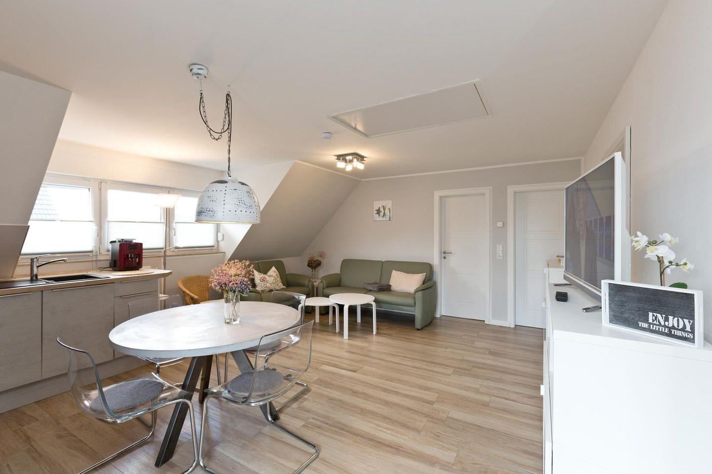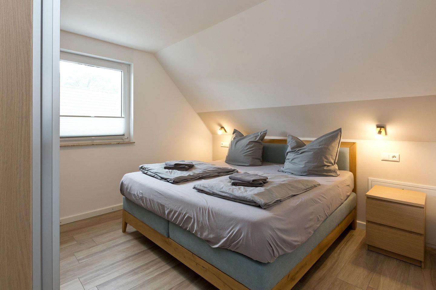 Die Ferienwohnung bietet Platz für 4 Personen. Ausgestattet mit 2 Schlafzimmern, 1 Gäste-WC mit Waschtrocknermaschine, 1 Wohnzimmer mit Flachbildschirm, Stereoanlage mit DVD-Player, sowie eine Küche mit vielen hochwertig Elektrogeräten (Spülmaschine, Kühl/Gefrierschrank, Kombi-Backofen, Ceranfeld usw.) .In dem großzügigen Bad befindet sich ein WC, Waschbecken, Dusche, Whirlpool und Infrarot - Wärmekabine.