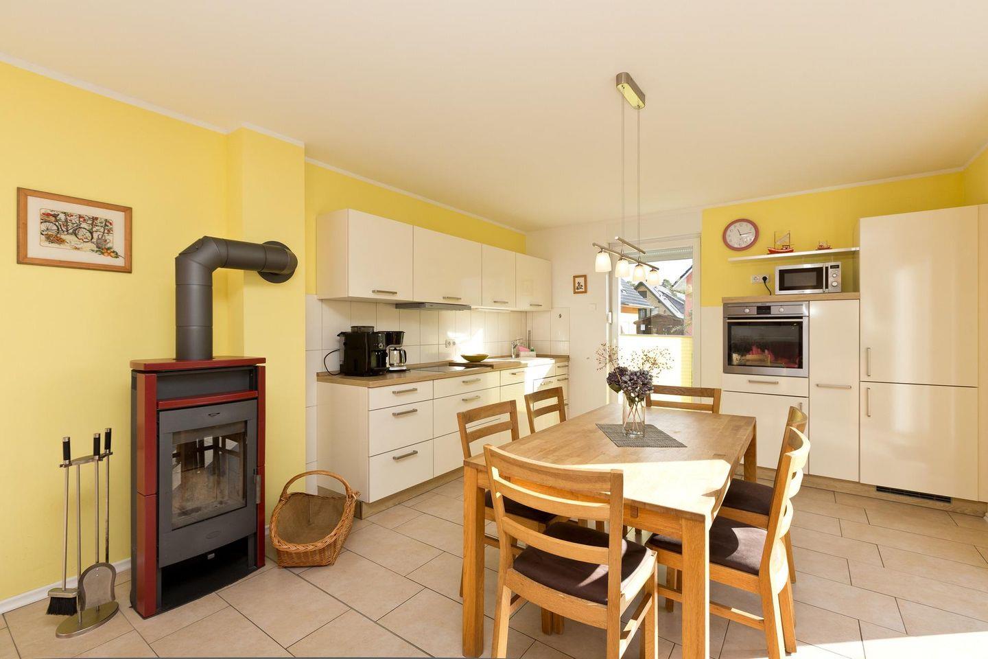 Im Erdgeschoss befindet sich der Wohnraum mit Koch.- und Essbereich, ein Schlafzimmer sowie ein Bad mit Sauna, WC, Pissoir, Waschbecken und Dusche. Die Fußbodenheizung sorgt für ein angenehmes Wohngefühl.