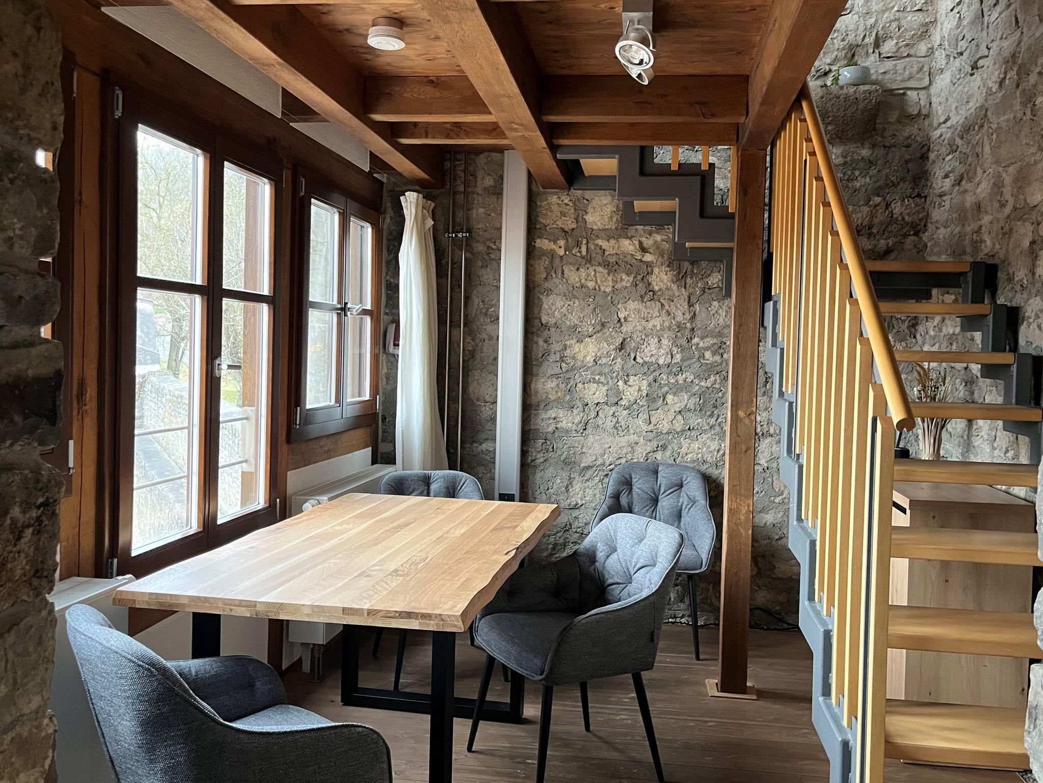 In der ersten Etage befinden sich die Küche, das Esszimmer und das Bad. Auf der nächsten Etage bietet sich eine Schlafmöglichkeit für eine 3. Person. Lesen Sie in der 3. Etage ein Buch, genießen ein Gläschen Wein und ein wunderschönes Panorama. Im Schlafgemach in der Turmspitze fühlen Sie sich ins Mittelalter zurückversetzt, werden aber vom modernen Komfort mit Ambiente verwöhnt.