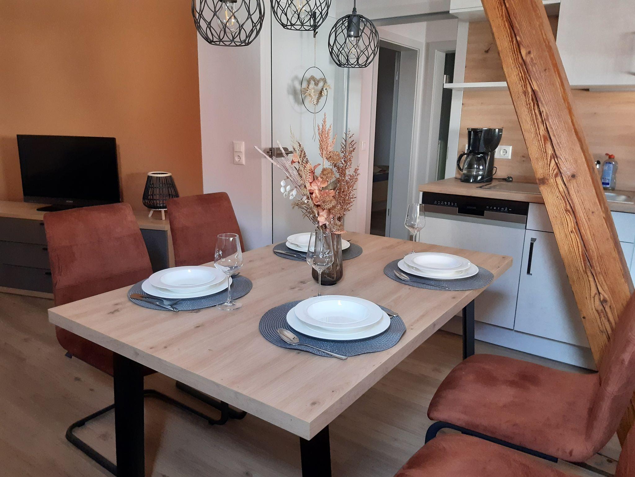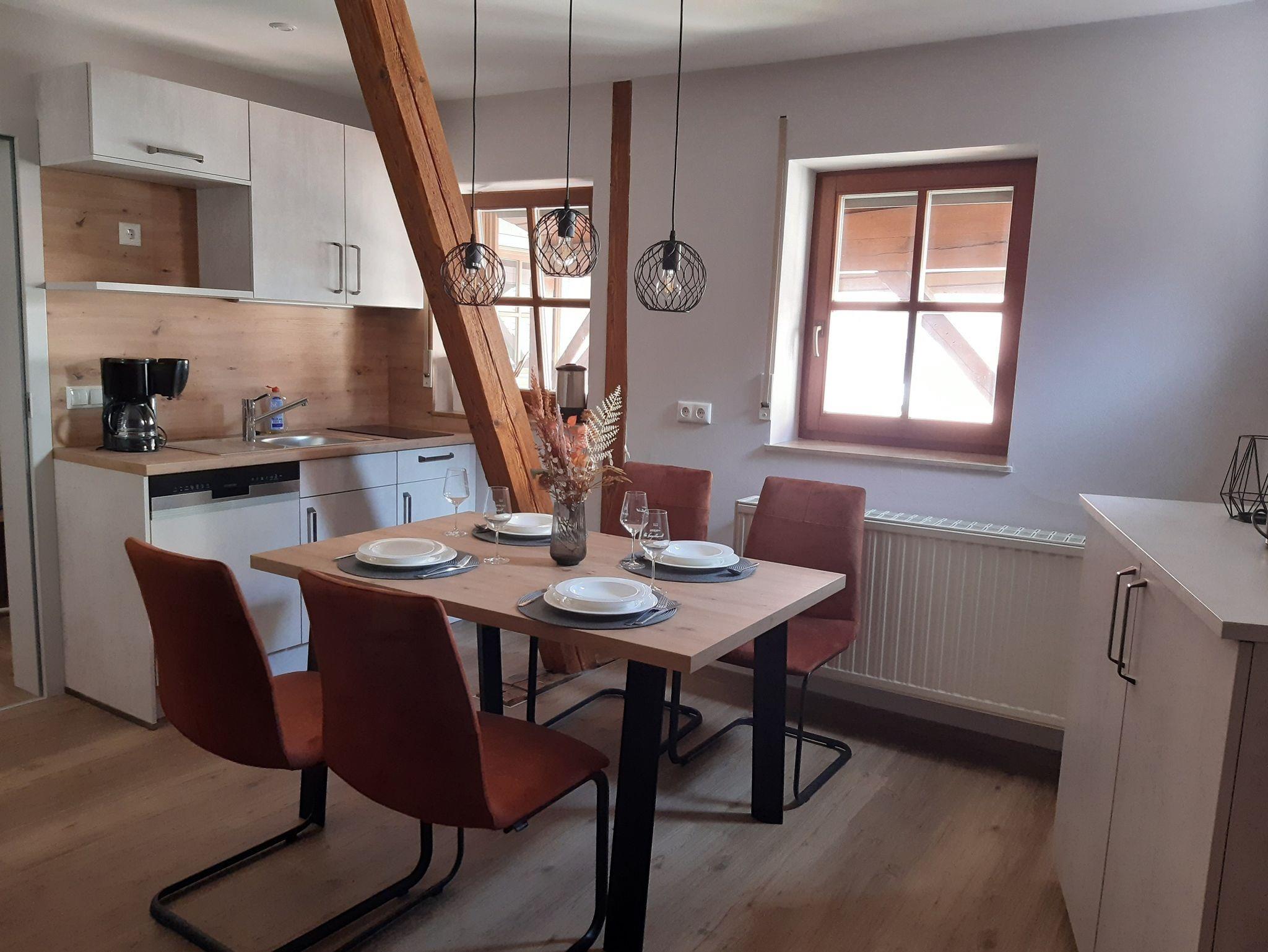 Die neu renovierte, gemütlich eingerichtete Ferienwohnung befindet sich im ruhigen Ortskern von Röttingen im lieblichen Taubertal. Die ca. 55 qm große Wohnung liegt im ersten Stock direkt im Weingut und neben der Stadtpfarrkirche St. Kilian. Die Wohnung verfügt über Dusche und WC mit Fön, Schlafzimmer mit Doppelbett, Wohn- und Essbereich mit gemütlicher Couch, Flachbildfernseher und Esstisch. Die kleine Küche verfügt über einen Herd (2 Platten) mit Ceranfeld, Geschirrspüler, Kühlschrank, Toaster, Wasserkocher und Kaffeemaschine. Der Überdachte Balkon befindet sich vor der Wohnung mit Sicht in den Innenhof.