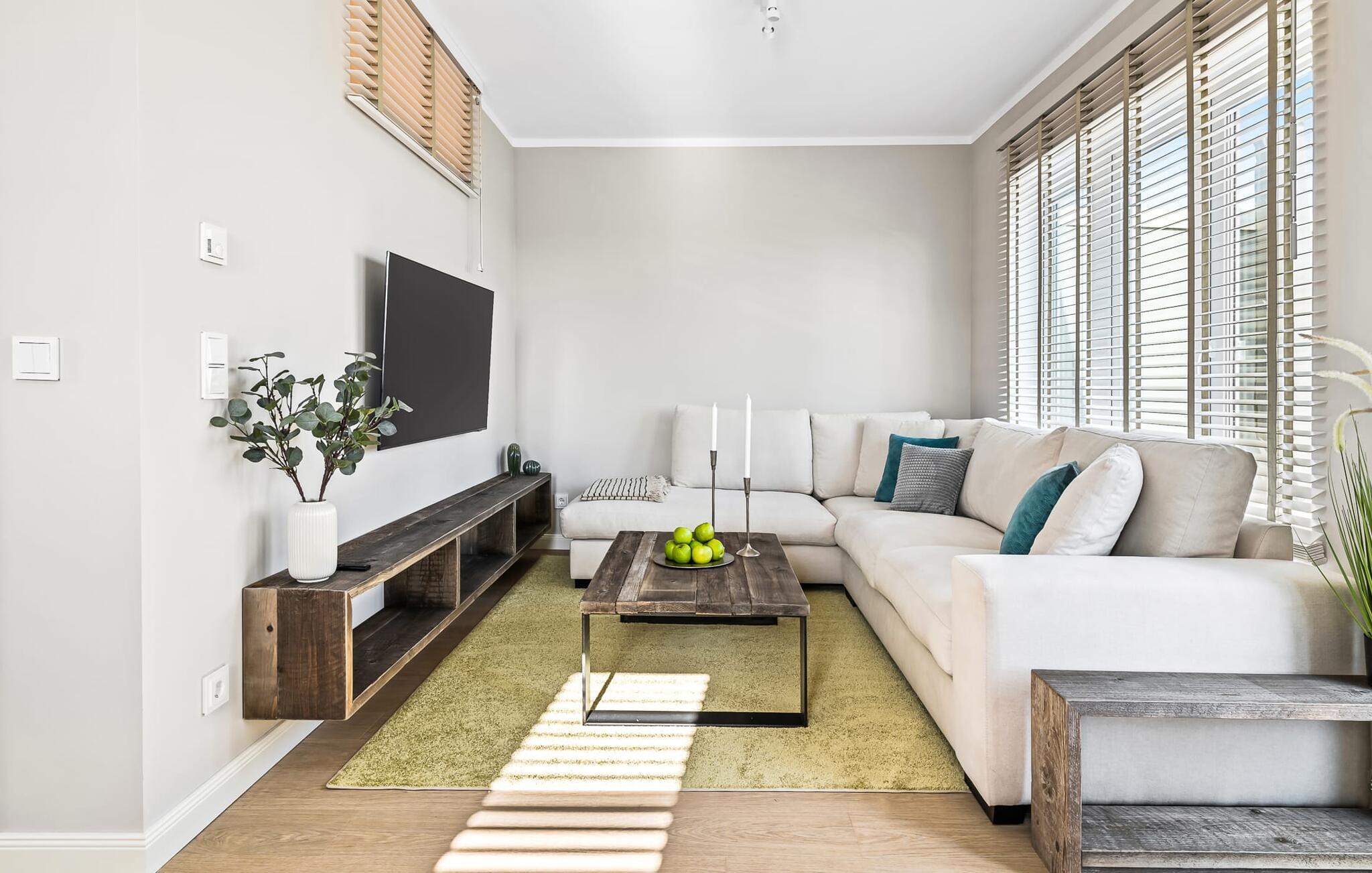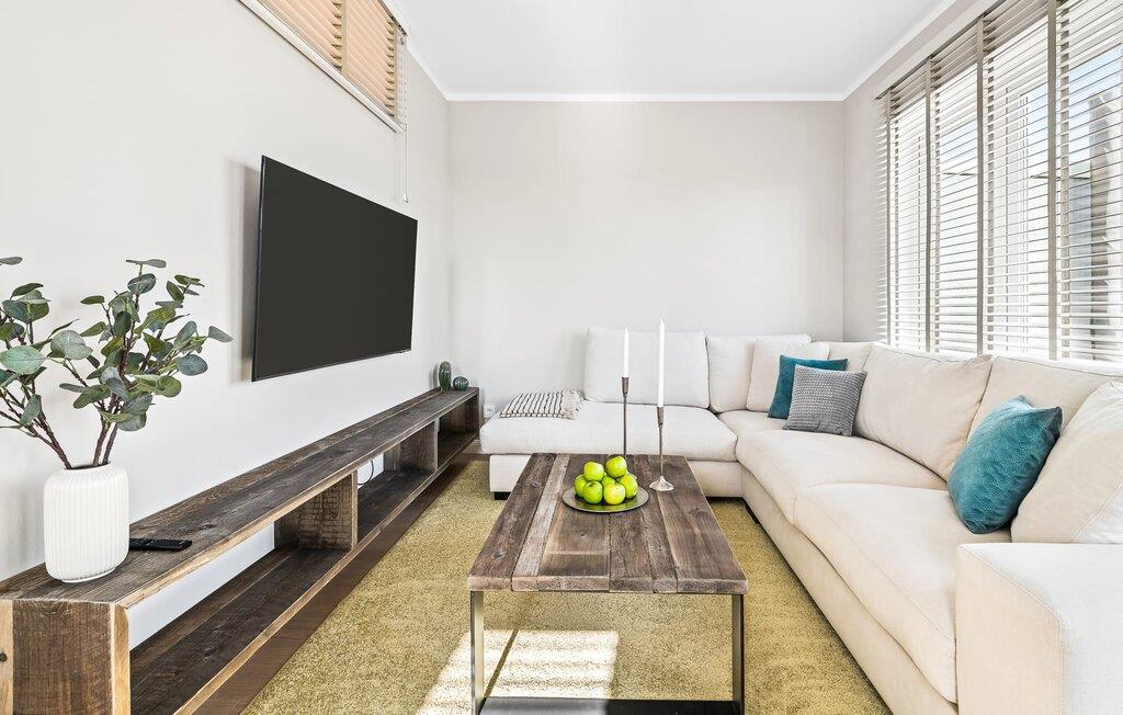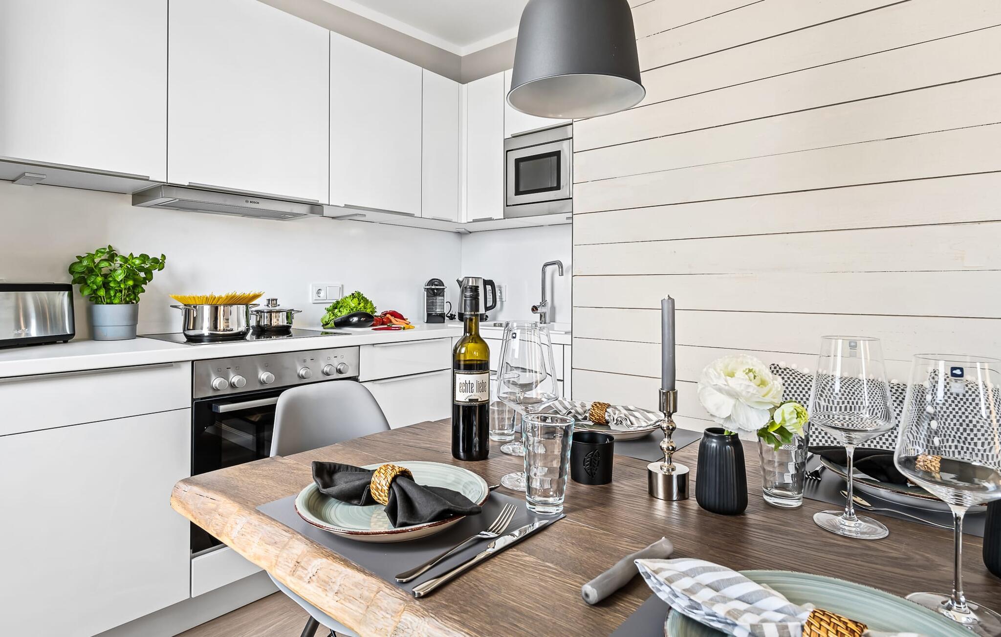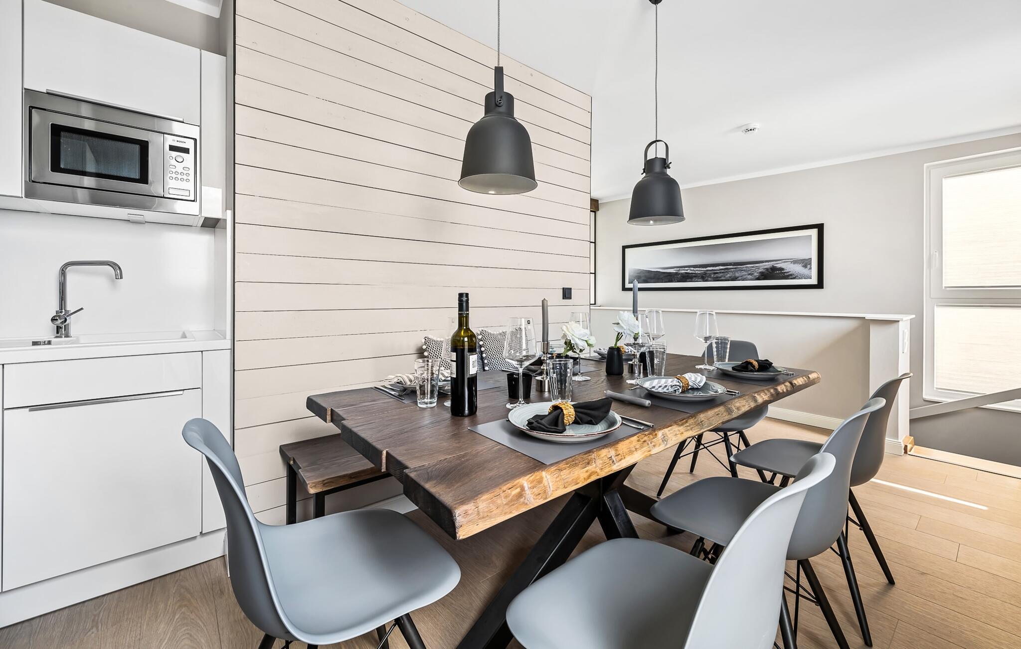 Det integrerte kjøkkenet er perfekt utstyrt og får amatørkokkens hjerte til å banke raskere. På den store, sørvestvendte terrassen med drømmeutsikt kan du arrangere hyggelige grillkvelder, slappe av i strandstolen eller nyte solen på solsengen.