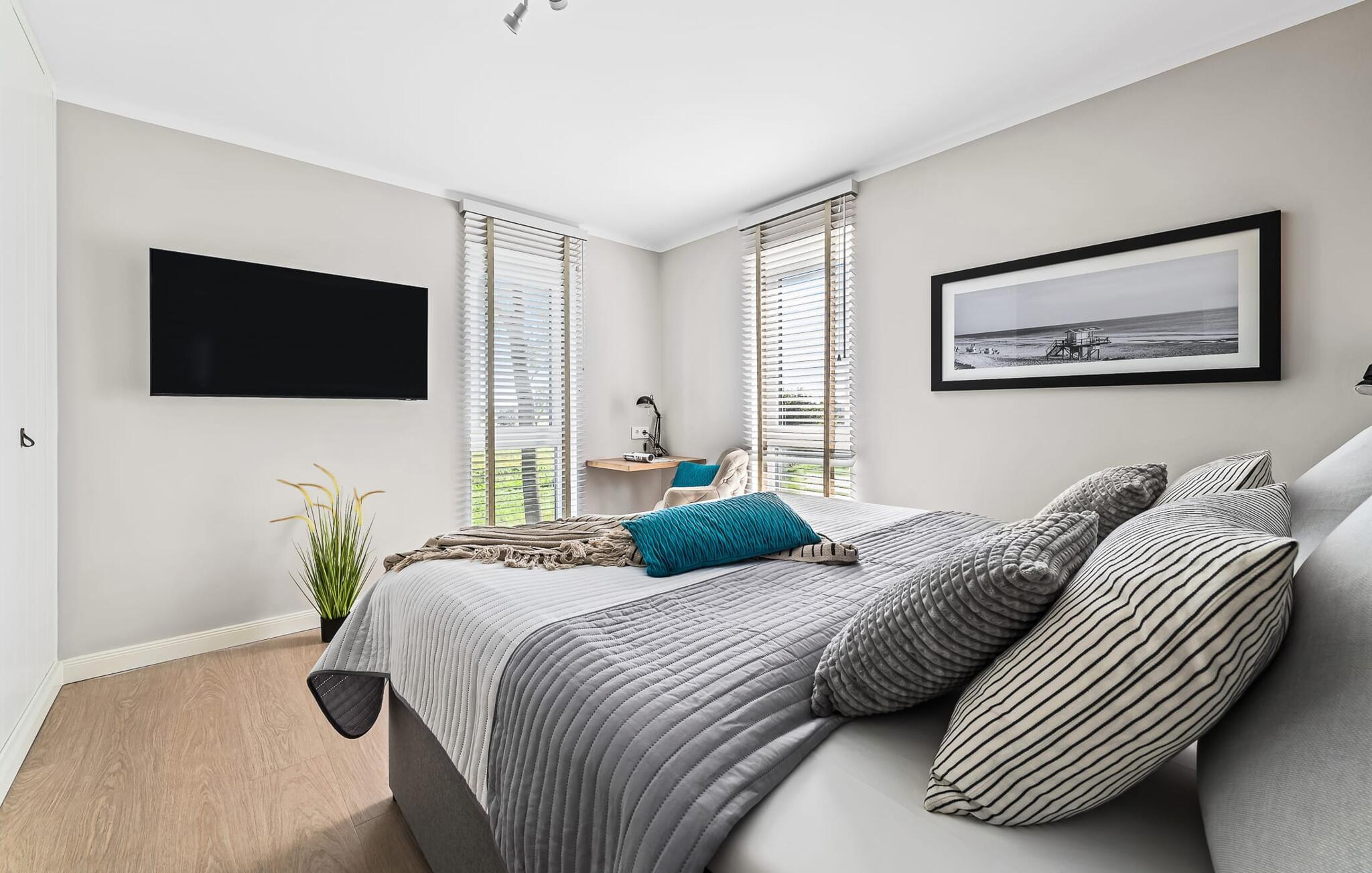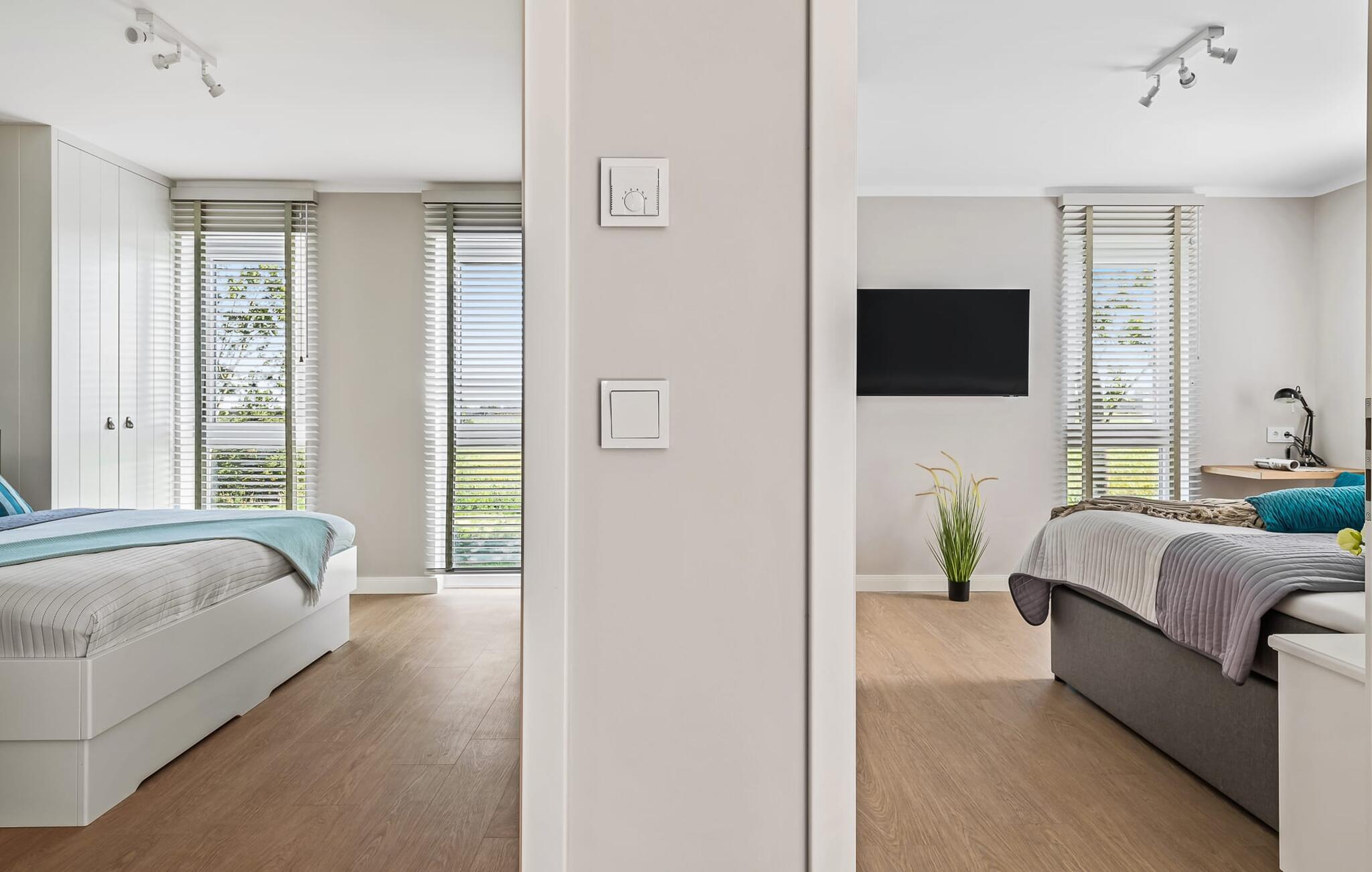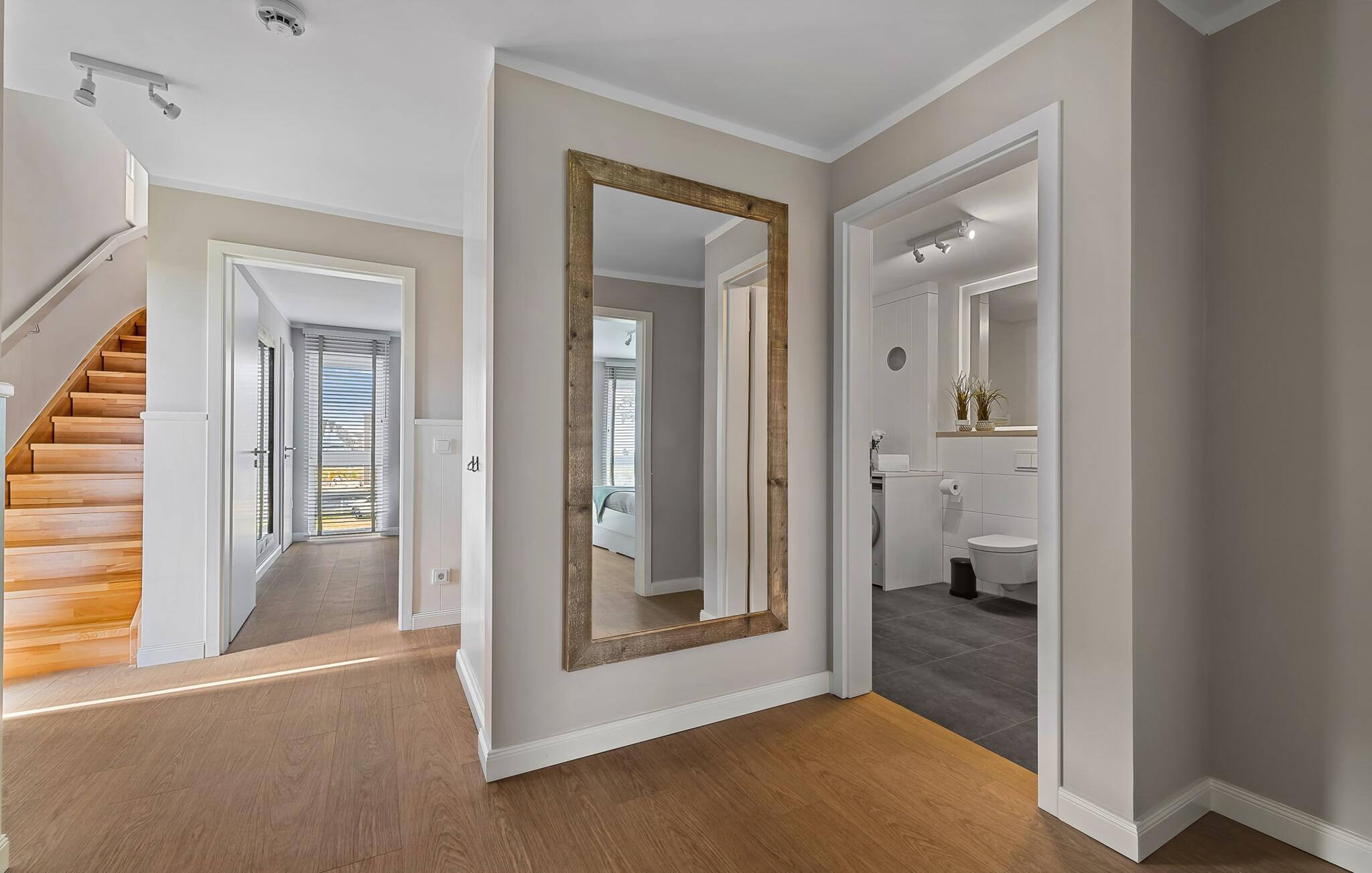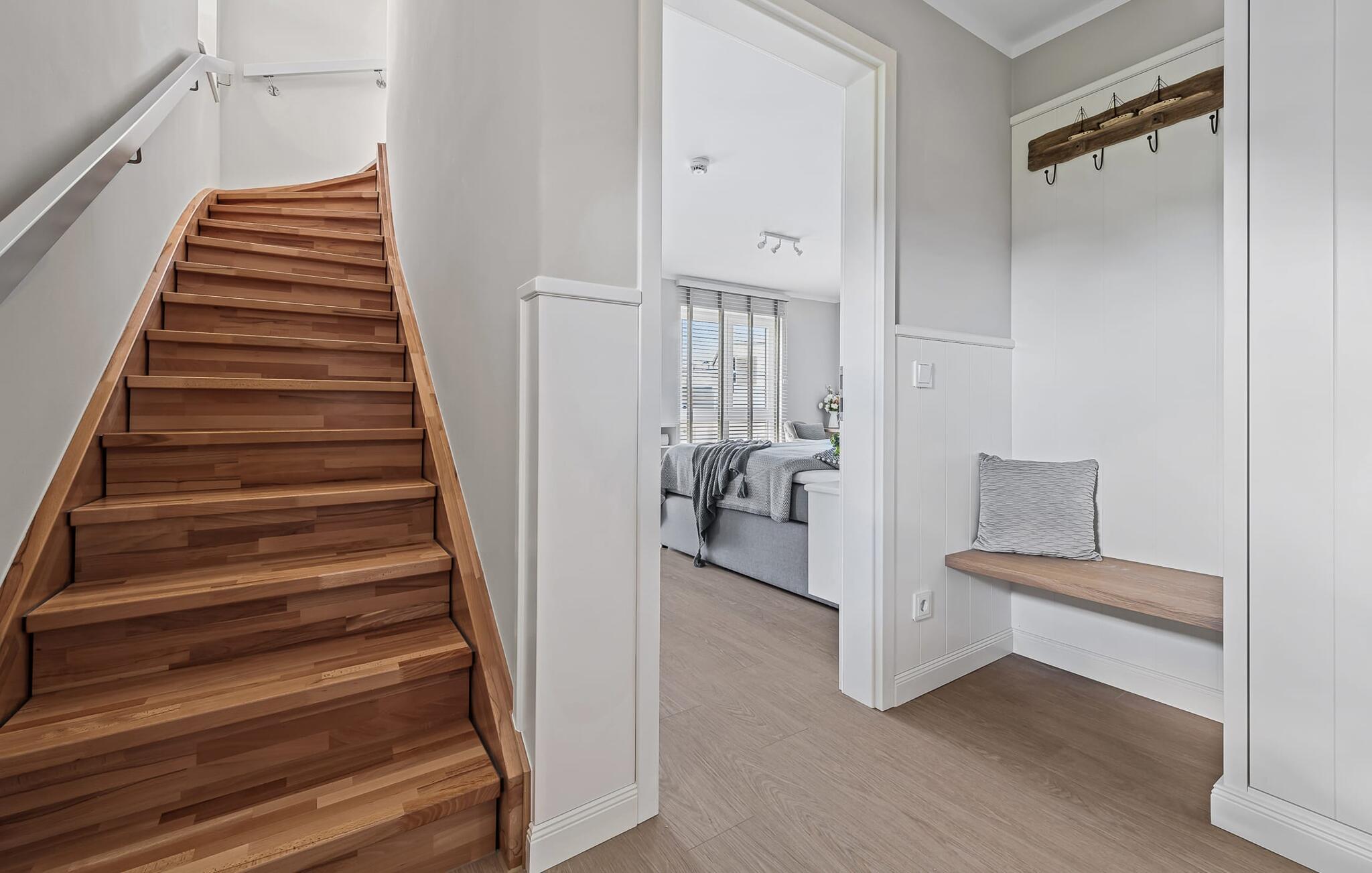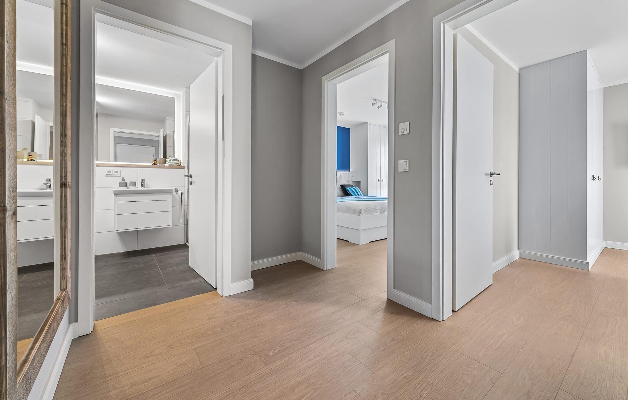 Når du kommer inn i ferieleiligheten i første etasje, begynner ferien fra første øyeblikk. Du befinner deg i leilighetens avslapningsområde. Det er tre soverom i denne etasjen. Uansett hvilket du velger, er du sikker på å få en god natts søvn. Alle soverommene er utstyrt med romslige dobbeltsenger og TV.