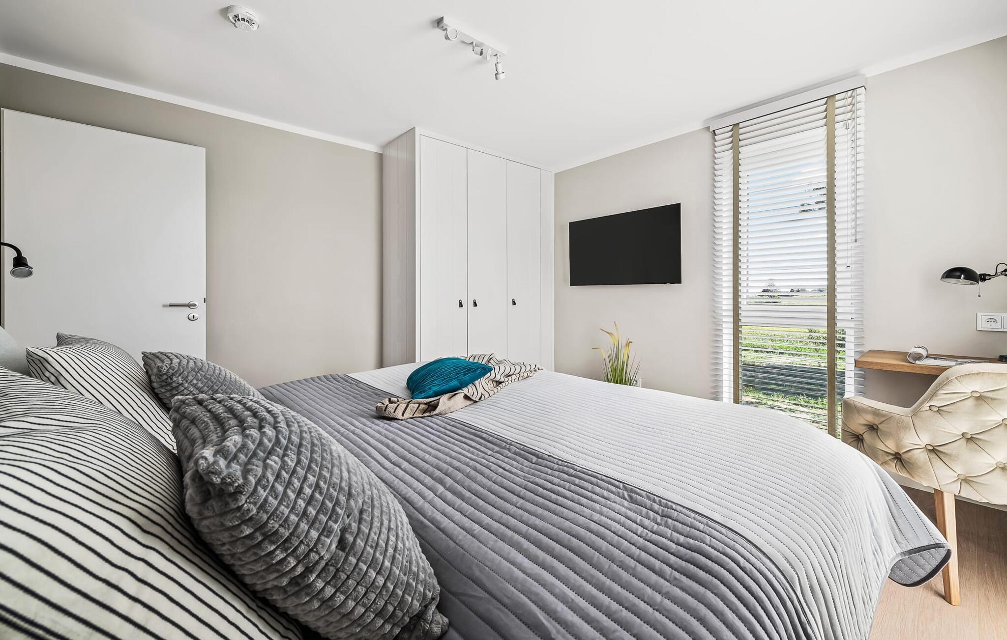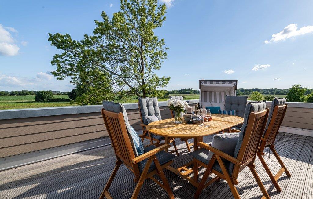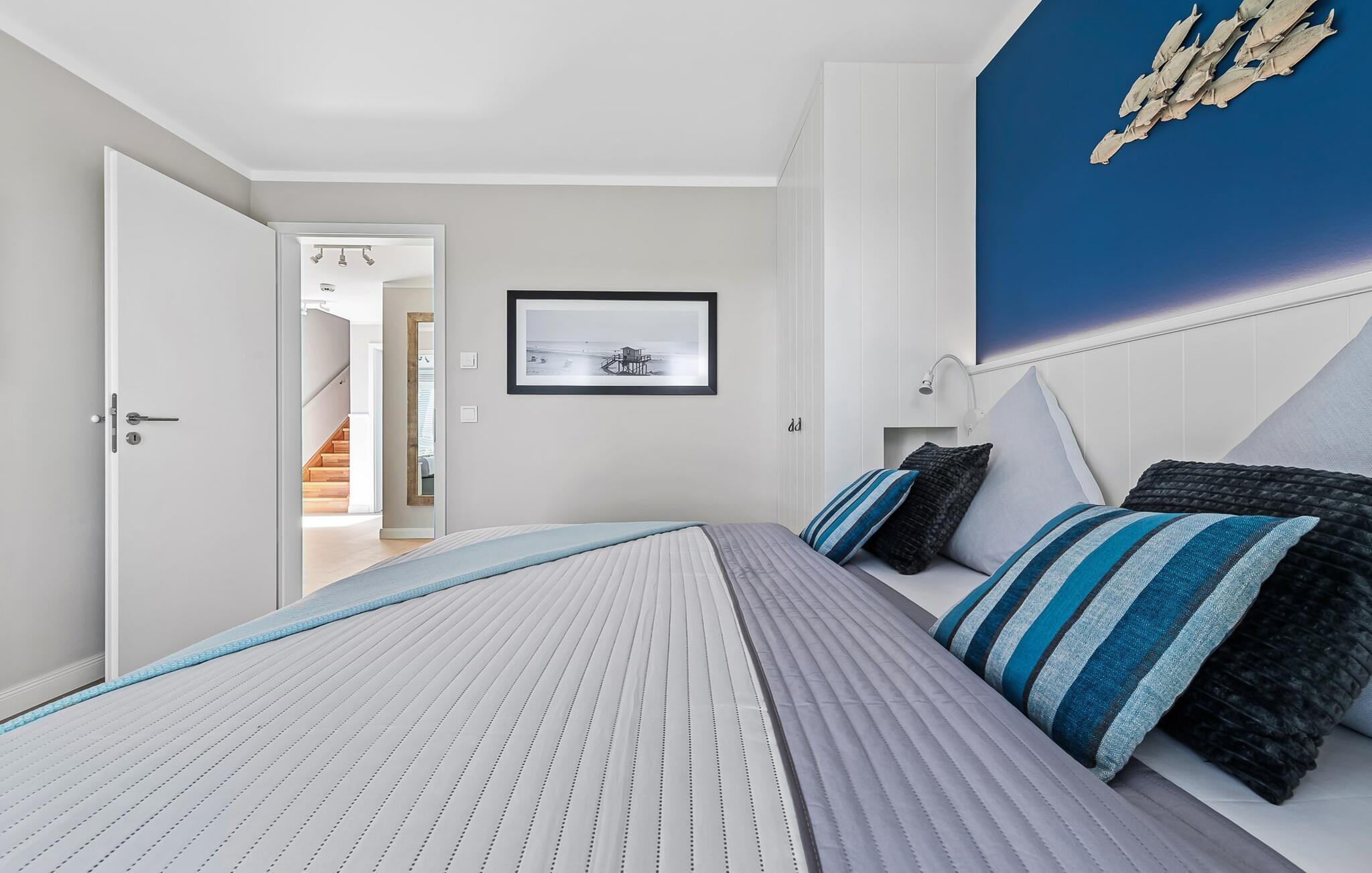 I første etasje blir du ønsket velkommen av Rüm Harts hjerte, den åpne stue- og spisestuen med vinduer fra gulv til tak og en tilstøtende terrasse. Med utsikt over de naturvernede saltmarkene og mot Østersjøen, helt i tråd med det frisiske mottoet Rüm Hart, Klaar Kiming (stort hjerte, vid horisont).