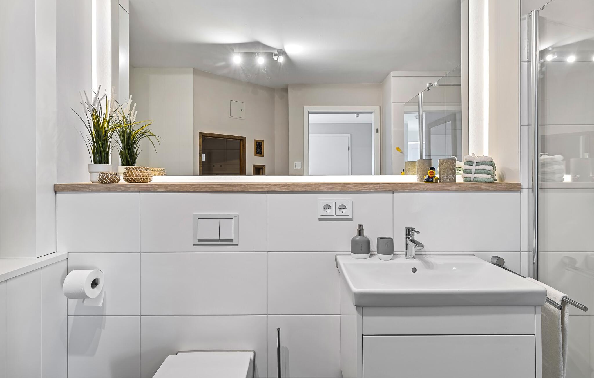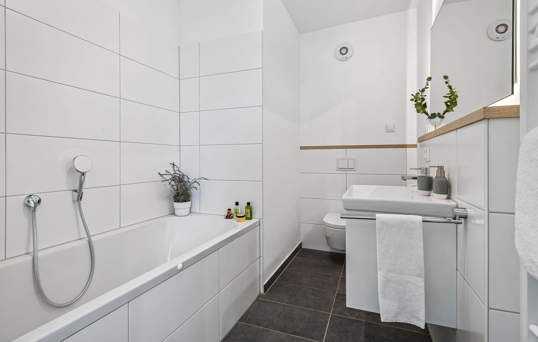 Et ekstra bad med ekstra toalett, servant og badekar gir nok plass og alternative muligheter for flere personer og avrunder fasilitetene i denne oasen av velvære, som gir avslapning når som helst på året.