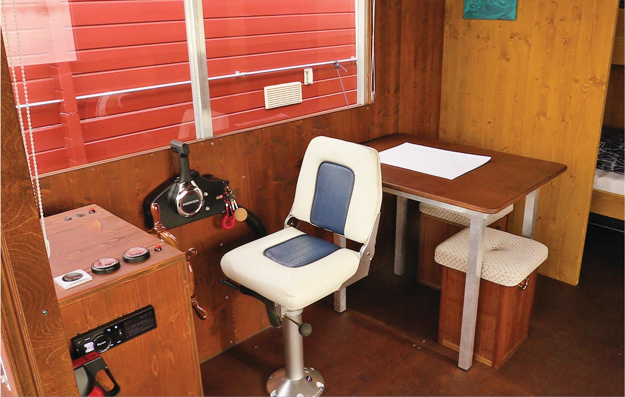 Du kommer inn i husbåten via den åpne terrassen i baugen og kommer til oppholdsrommet med styreposisjon. Her finner du også den komfortable sovesofaen, en flatskjerm-TV med Bose-lydanlegg og spiseplassen. Stuen grenser til sovealkoven med køyeseng og leder inn til det åpne minikjøkkenet med elektrisk kjøleskap. Ved siden av ligger hovedsoverommet med dobbeltseng og et lite, separat toalettrom med elektrisk avtrekksvifte og håndvask. Dusj med varmt vann er plassert utenfor på baksiden.