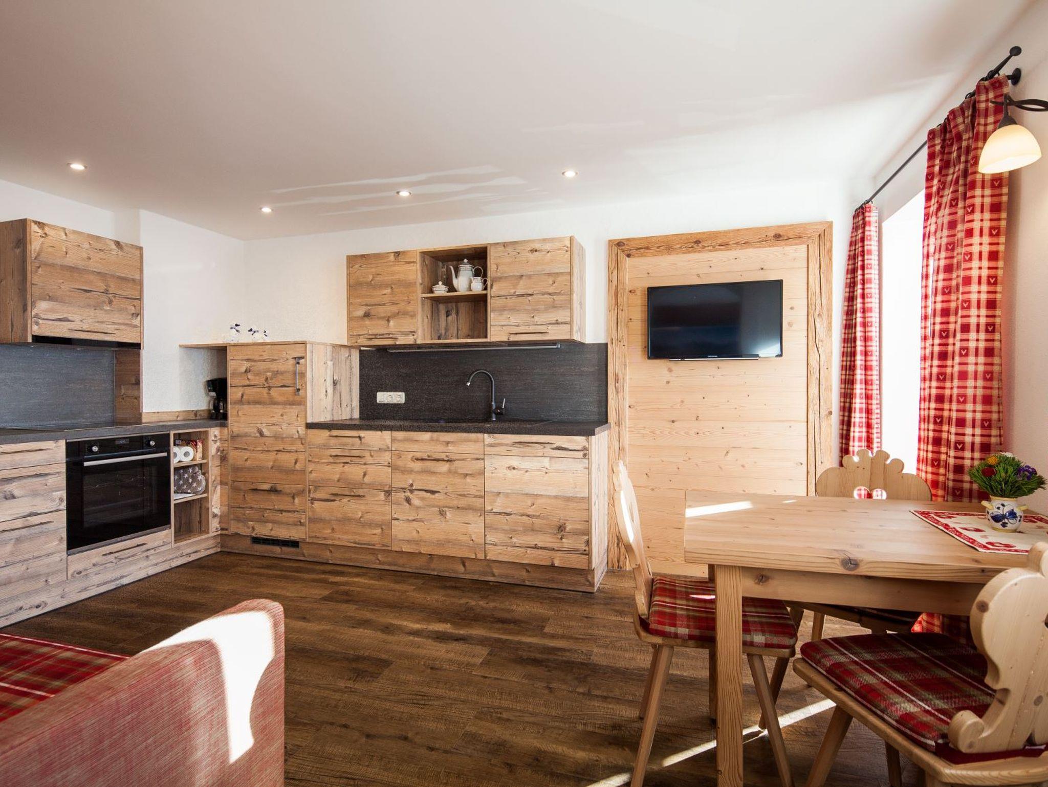 Ferienwohnung 4 mit direktem Bergblick, im ländlichen Stil eingerichtet. Wohn- und Schlafraum sind durch einen offenen Durchgang getrennt.