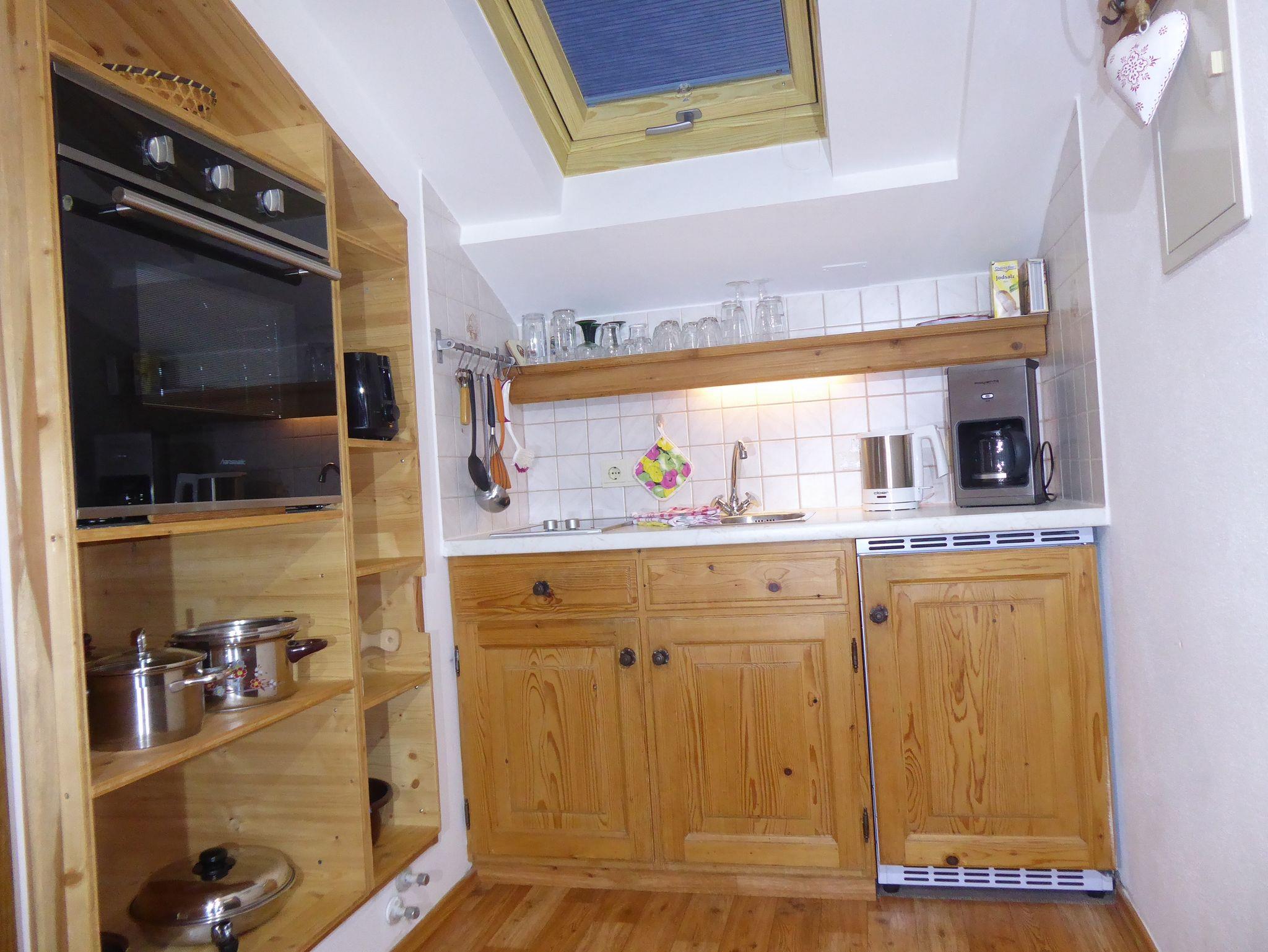 Diese komfortabel und gemütlich eingerichtete Mansarden-Ferienwohnung ist 28 m² groß, bietet Platz für 2 Personen und liegt im 2. Stock unseres Hauses. Die Wohnung verfügt über: einen Wohn-Schlafraum mit Doppelbett, Kleinküche (2-Plattenherd, Toaster, Wasserkocher, Kaffeemaschine, Backofen, Kühlschrank mit Gefrierfach), Essecke, Couch, Flachbildschirm-TV, Bad (DU/WC) und Balkon. Gerne können Sie zusätzlich Brötchenservice buchen. Ein Parkplatz am Haus steht für Sie bereit.