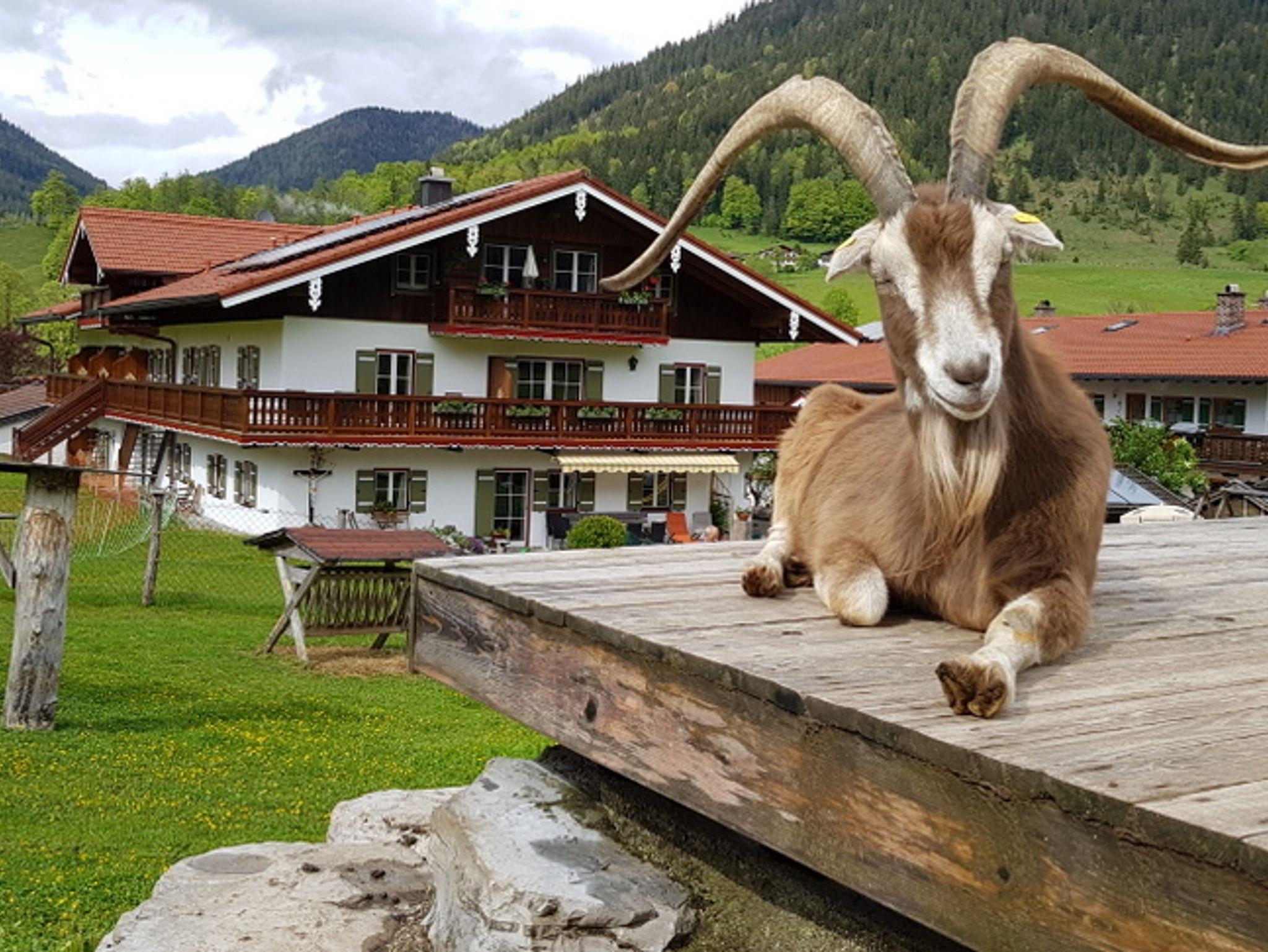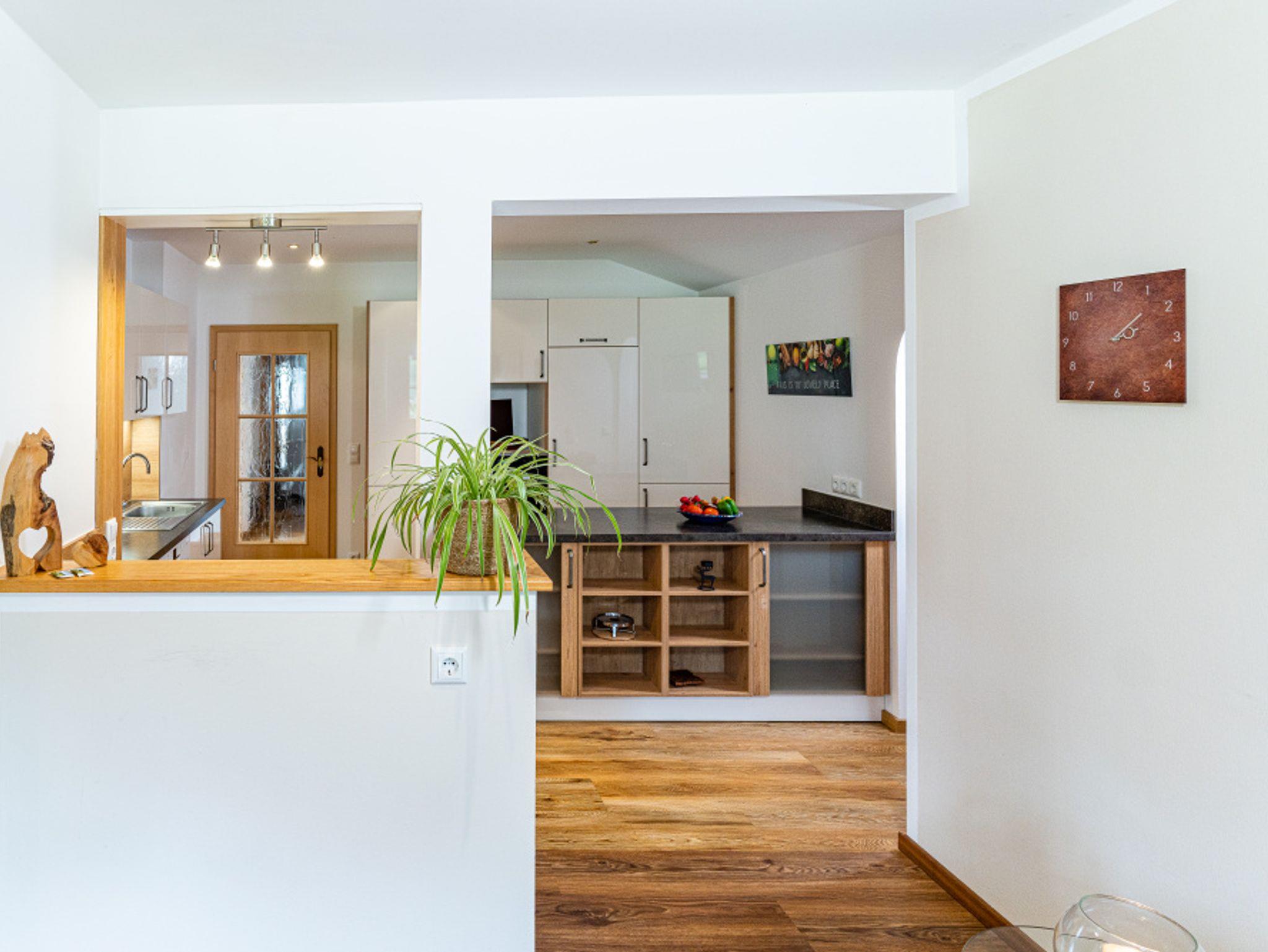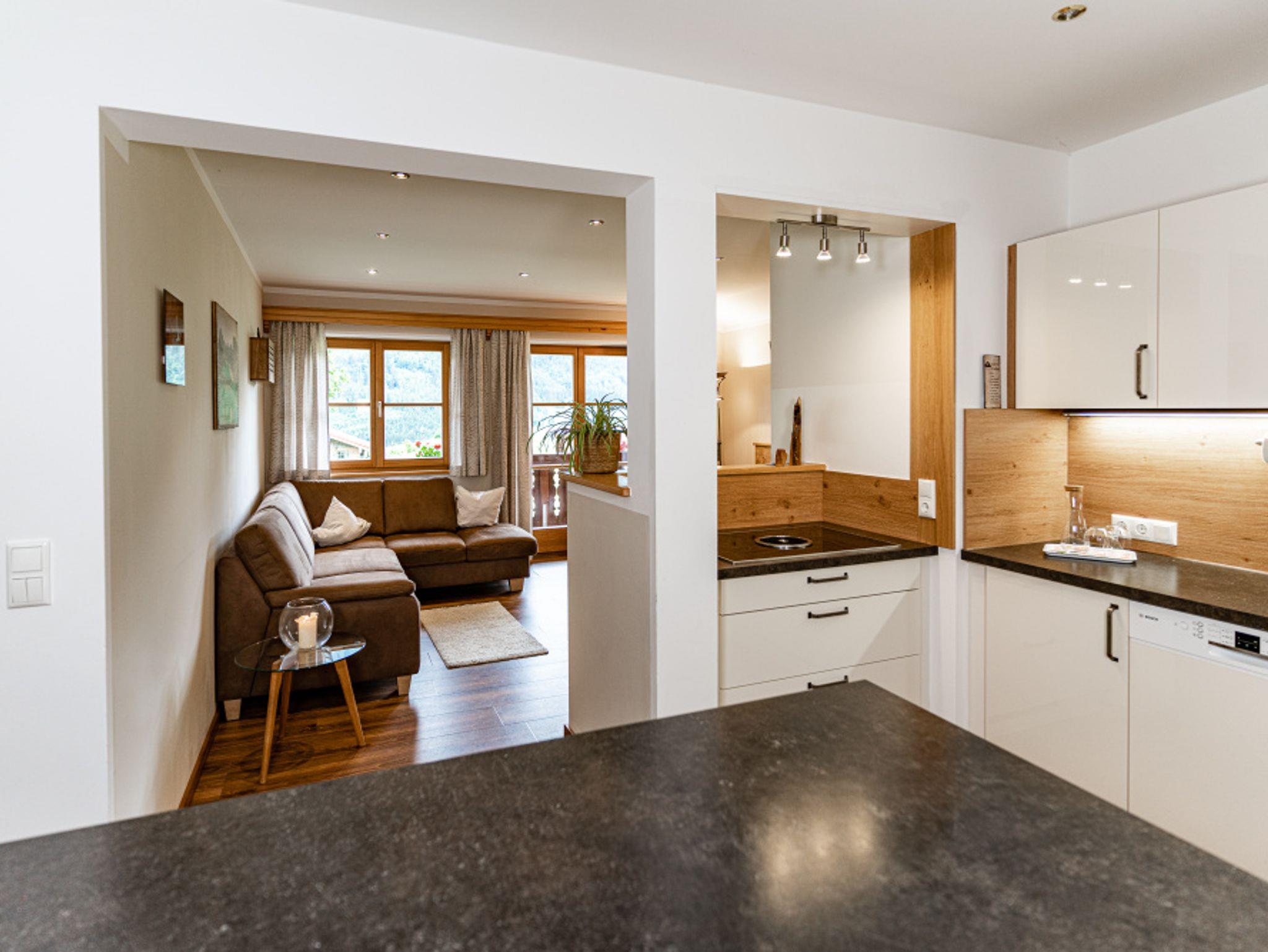 Eine hinreißende Aussicht genießen Sie in unserer großen Ferienwohnung für bis zu 6 Personen – perfekt für Familienurlaube oder für eine tolle Zeit mit Freunden! In der hellen, modern eingerichteten Küche kocht man mit Blick auf die Schärtenalm und hat eine freie Sicht über das Wohnzimmer hinaus zu den Hoftieren.
