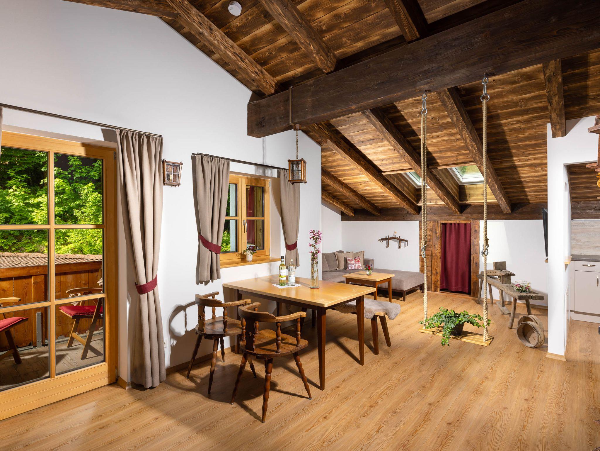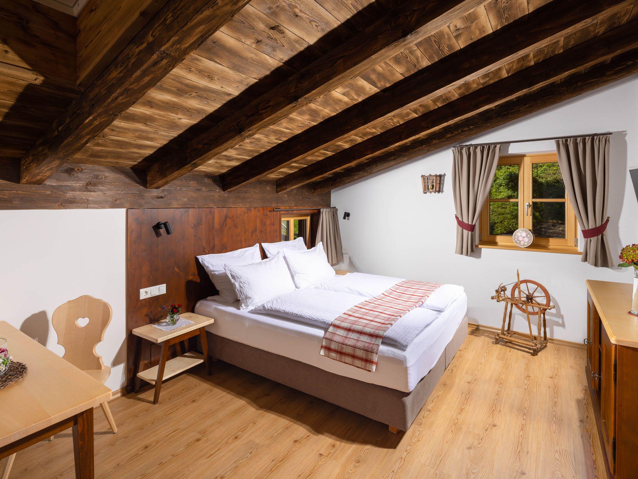 Das Ferien-Appartement ALPENZAUBER bietet mit antiken Artefakten und historischen Bildern einen kleinen Einblick in die ursprüngliche Lebensweise auf einem oberbayerischen Bauernhof. Lassen Sie sich von der Nostalgie verzaubern! Natürlich müssen Sie trotzdem nicht auf den gehobenen Komfort einer Ferienwohnung nach neuestem Standard verzichten. Boxspringbetten in den Schlafzimmern, separate Badezimmer mit Badewanne, ein großzügiger Wohnbereich mit privatem Südbalkon und voll ausgestatteter Einbauküche lassen keine Wünsche offen und laden zum Verweilen ein. Auf 80 qm Wohnfläche genießen Sie Ihren Urlaub vom ersten bis zum letzten Tag. Die Verwendung natürlicher Materialien wie gehacktes, Mond geschlagenes Holz oder Naturstein sind eine Hommage an alte Zeiten und ergeben ein freundliches und angenehmes Raumklima. Die großzügige Wohnlandschaft mit Flachbild-Fernseher bringt Entspannung auch bei ungemütlichem Wetter. Wenn Sie es noch uriger wünschen, können Sie auch das ehemalige Bienenhaus mit eigenem Holzofen für einen Spieleabend oder eine Geburtstagsfeier mieten. Sprechen Sie einfach mit uns, wir stehen Ihnen gerne mit Rat und Tat zur Seite. Bei Belegung mit zwei Personen steht Ihnen ein Schlafzimmer zur Verfügung, das zweite Schlafzimmer kann gegen Aufpreis mitbenutzt werden. Beistellbett auf Anfrage bei Vermieter möglich.