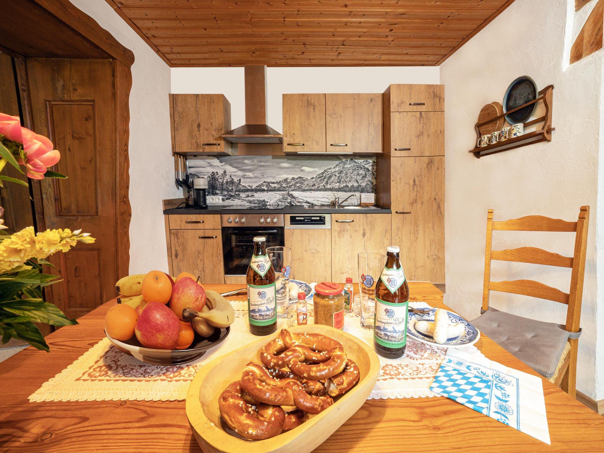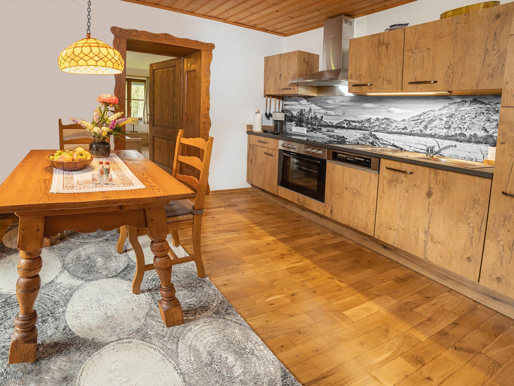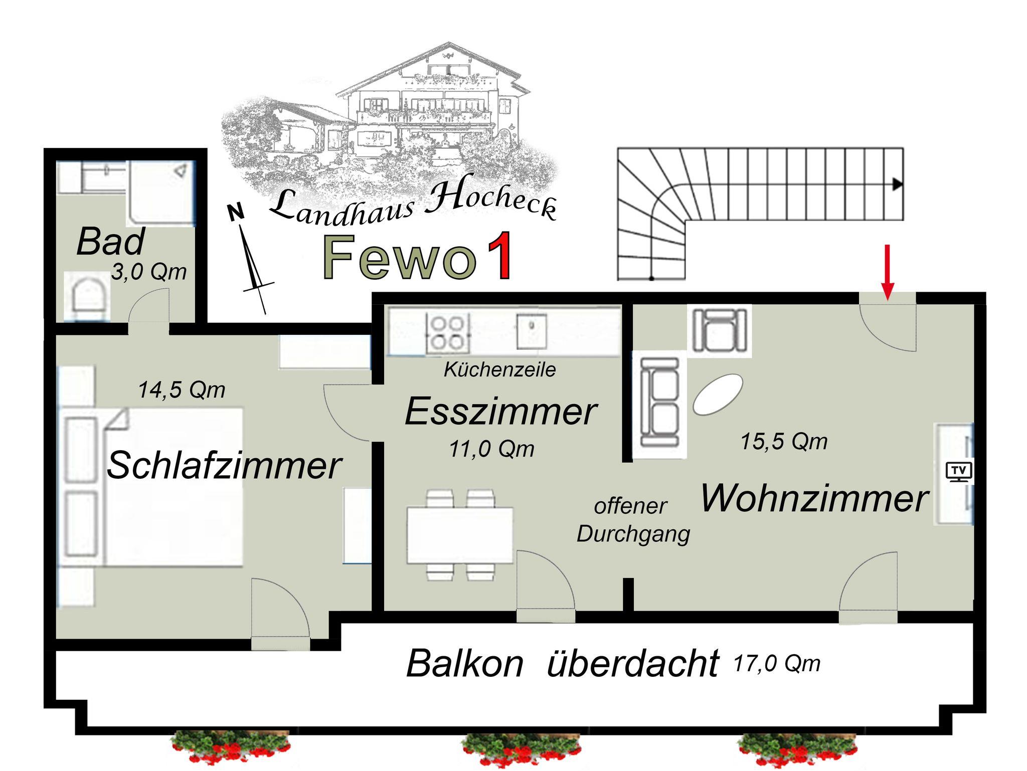 Landhaus Hocheck Ferienwohnungen, Ferienwohnung Nr. 1, 1-2 Pers., 48 qm, Dusche/WC, Südbalkon, TV, 1 Schlafzimmer + Wohnschlafzimmer, neue Wohnküche