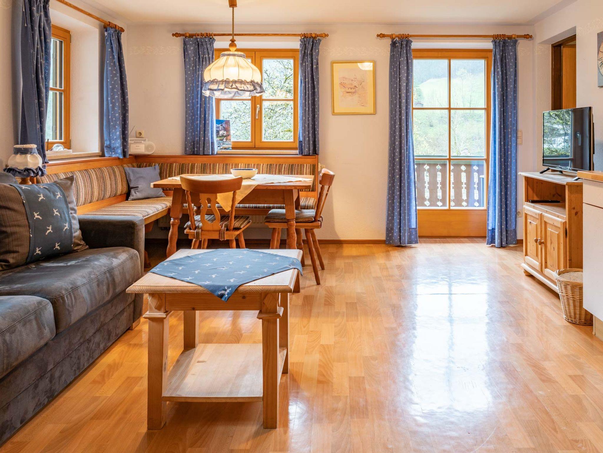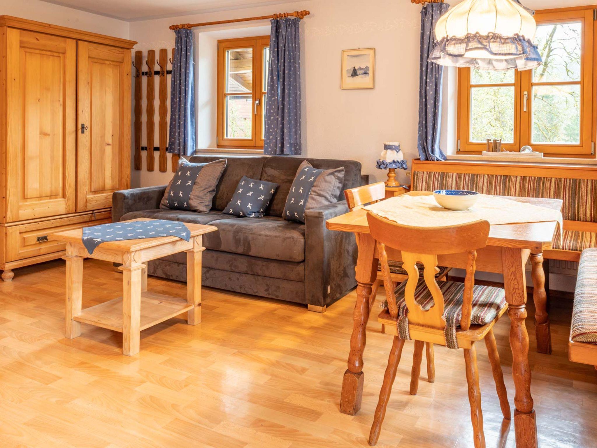Grandioser Ausblick auf Watzmann, Hochkalter und Reiteralpe, großer sonniger Balkon nach Süd-Osten, vollausgestattete Küche mit rustikaler Eckbank und gemütlichen Sofa (3. Schlafmöglichkeit), Schlafzimmer mit Doppelbett, großzügiges Bad mit Dusche/WC.
